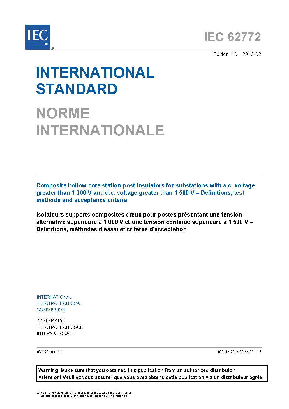 IEC 62772:2016 Composite hollow core station post insulators for substations with a.c. voltage greater than 1 000 V and d.c. voltage greater than 1 500 V - Definitions, test methods and acceptance criteria