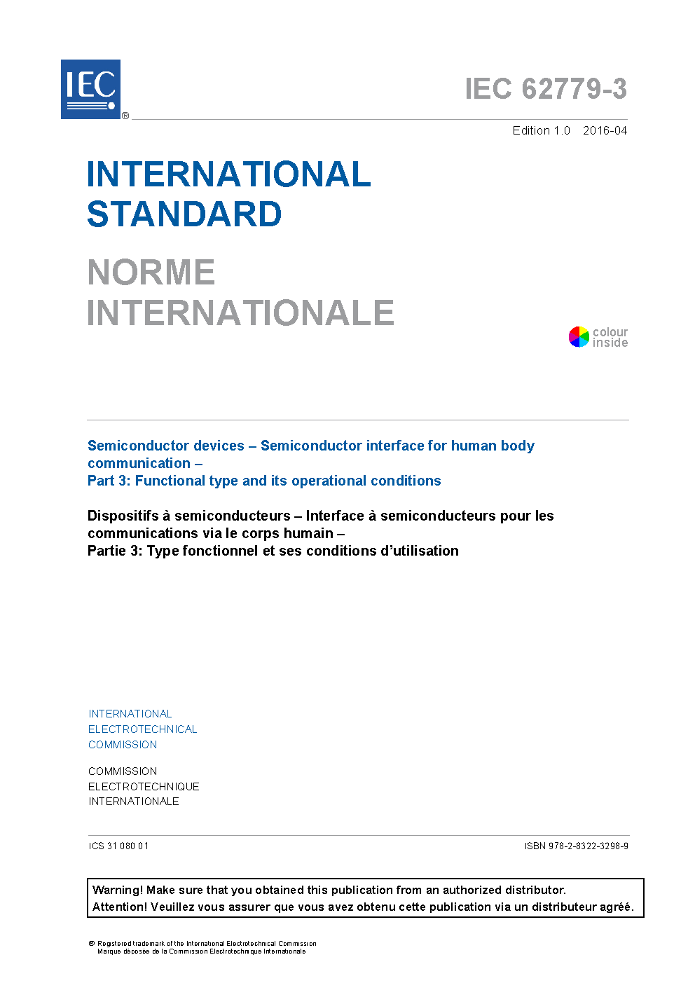 IEC 62779-3:2016 Semiconductor devices - Semiconductor interface for human body communication - Part 3: Functional type and its operational conditions