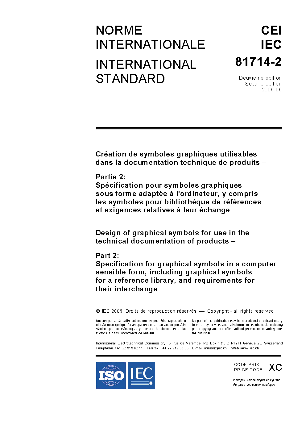 IEC 81714-2:2006 Specifies requirements for graphical symbols to be included in a reference symbol library in a computer sensible form, and requirements for their interchange among computer aided tools. The reference symbol library may be used as a basis for the design and editing of documents, and for the interchange of documents and graphical symbol libraries among computer-aided tools.