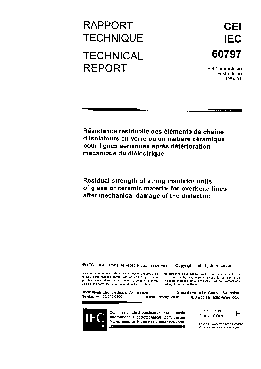 IEC TR 60797:1984 Residual strength of string insulator units of glass or ceramic material for overhead lines after mechanical damage of the dielectric