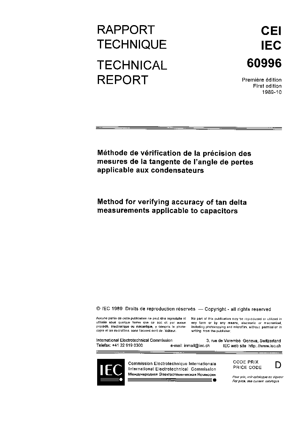 IEC TR 60996:1989 Method for verifying accuracy of tan delta measurements applicable to capacitors