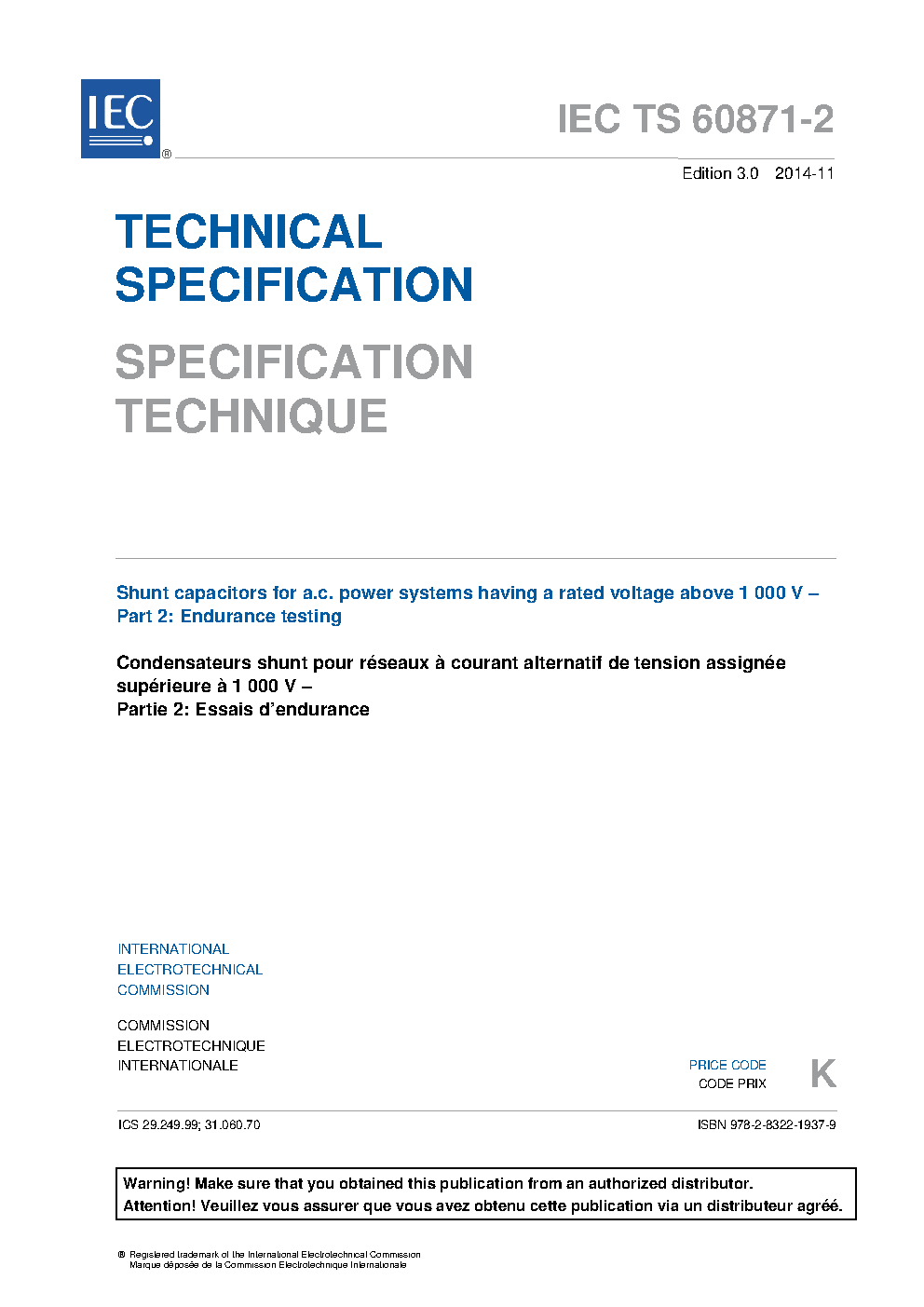 IEC TS 60871-2:2014 Shunt capacitors for a.c. power systems having a rated voltage above 1 000 V - Part 2: Endurance testing