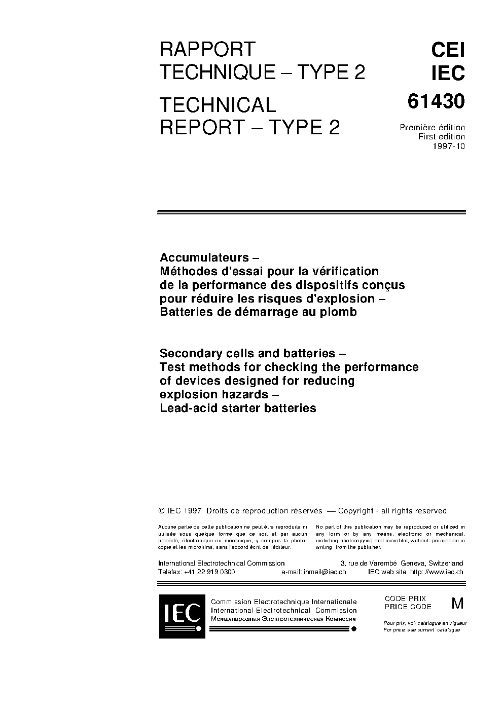 IEC TS 61430:1997 Secondary cells and batteries - Test methods for checking the performance of devices designed for reducing explosion hazards - Lead-acid starter batteries