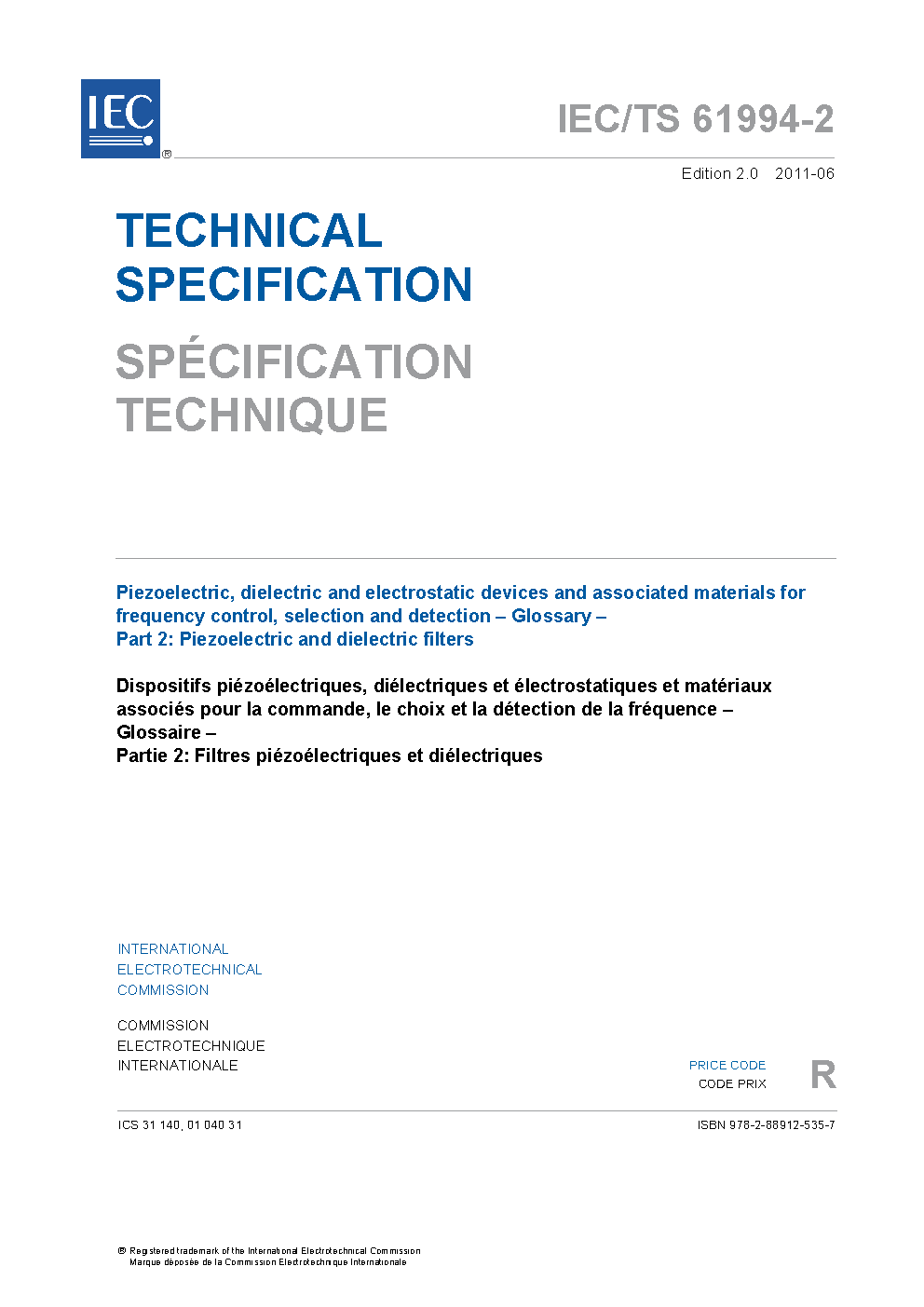 IEC/TS 61994-2:2011 is a technical specification that gives the terms and definitions for piezoelectric and dielectric filters representing the present state of the art, which are intended for use in the standards and documents of IEC technical committee 49. The main changes with respect to the previous edition are listed below: