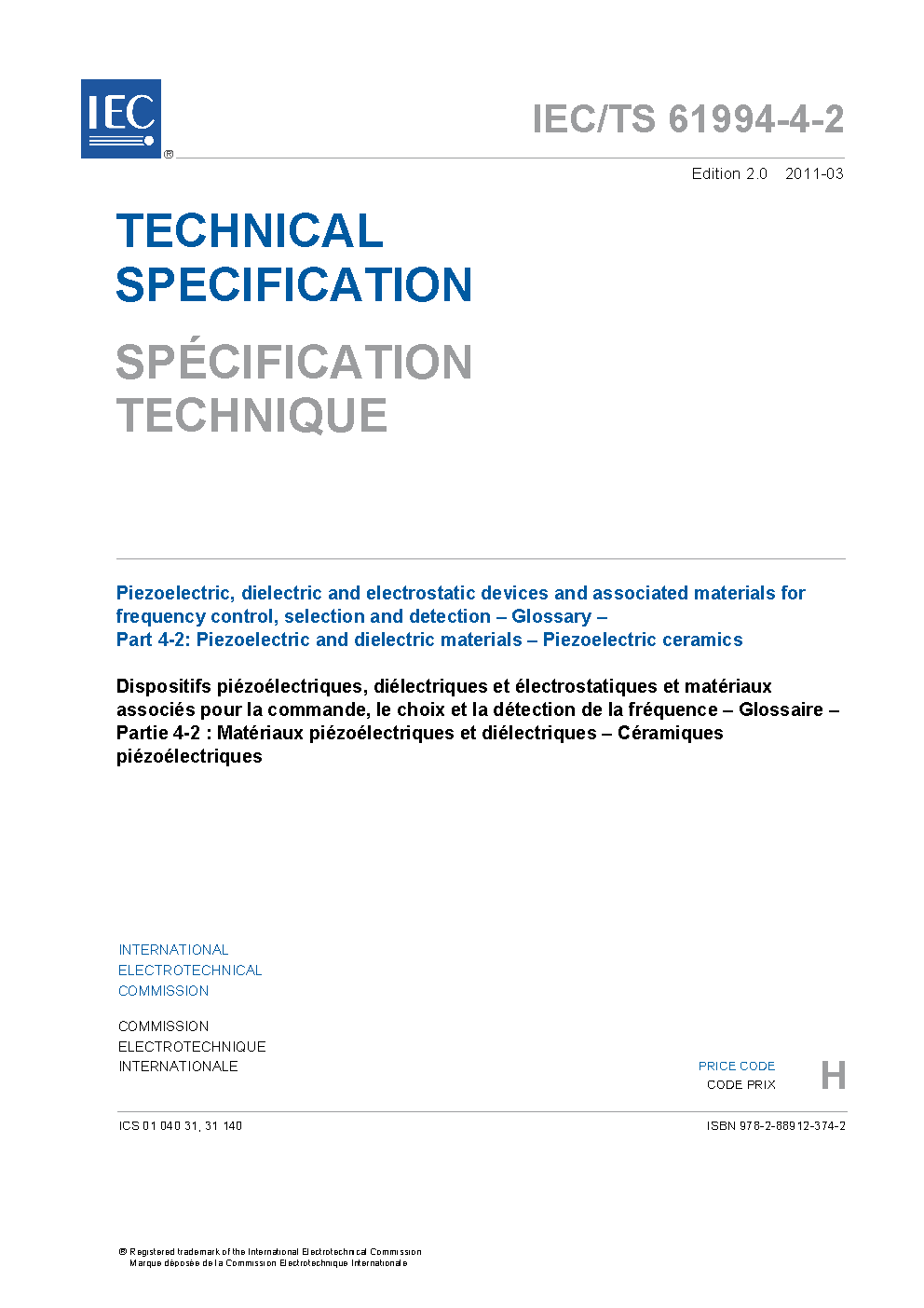 IEC TS 61994-4-2:2011 Piezoelectric, dielectric and electrostatic devices and associated materials for frequency control, selection and detection - Glossary - Part 4-2: Piezoelectric and dielectric materials - Piezoelectric ceramics