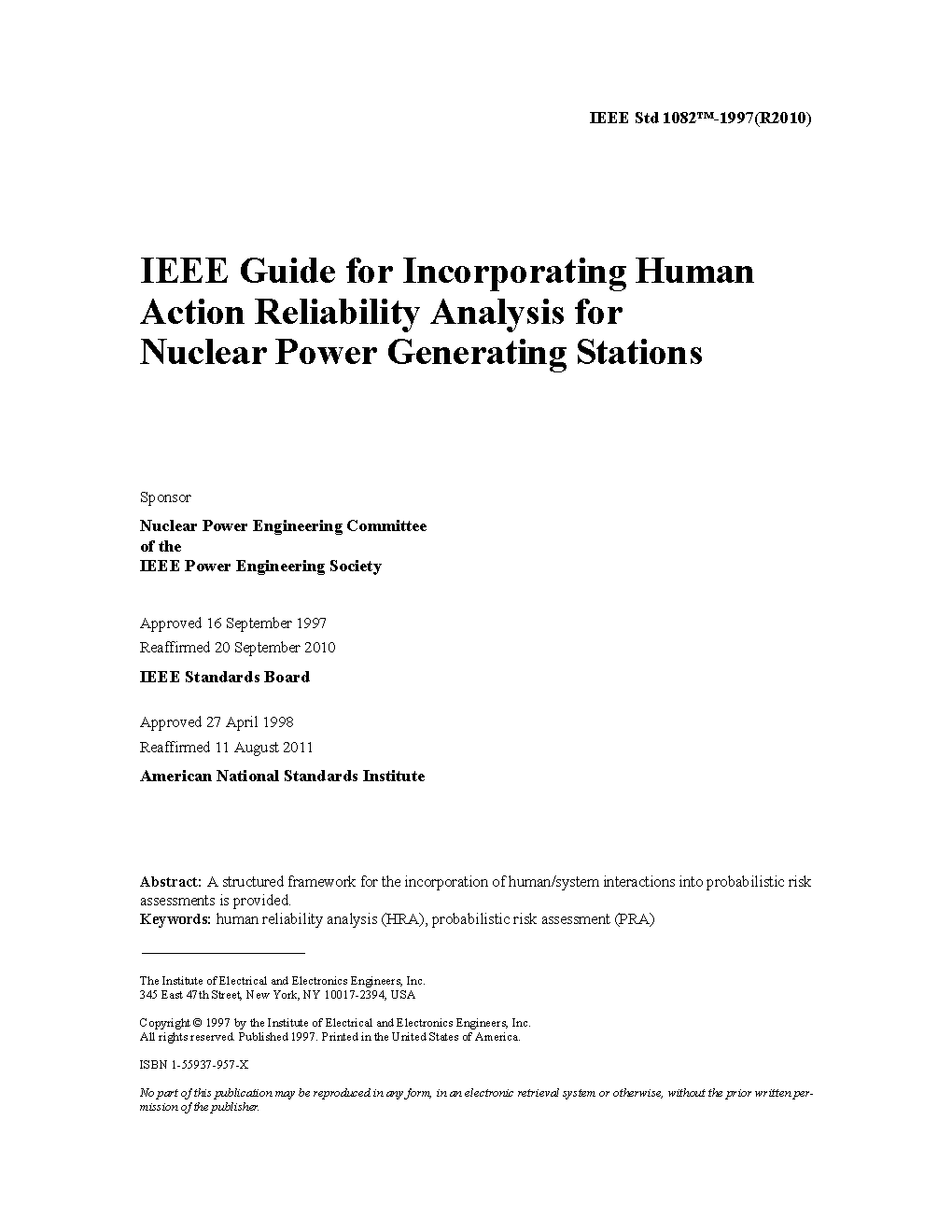 IEEE Guide for Incorporating Human Reliability Analysis into Probabilistic Risk Assessments for Nuclear Power Generating Stations and Other Nuclear Facilities