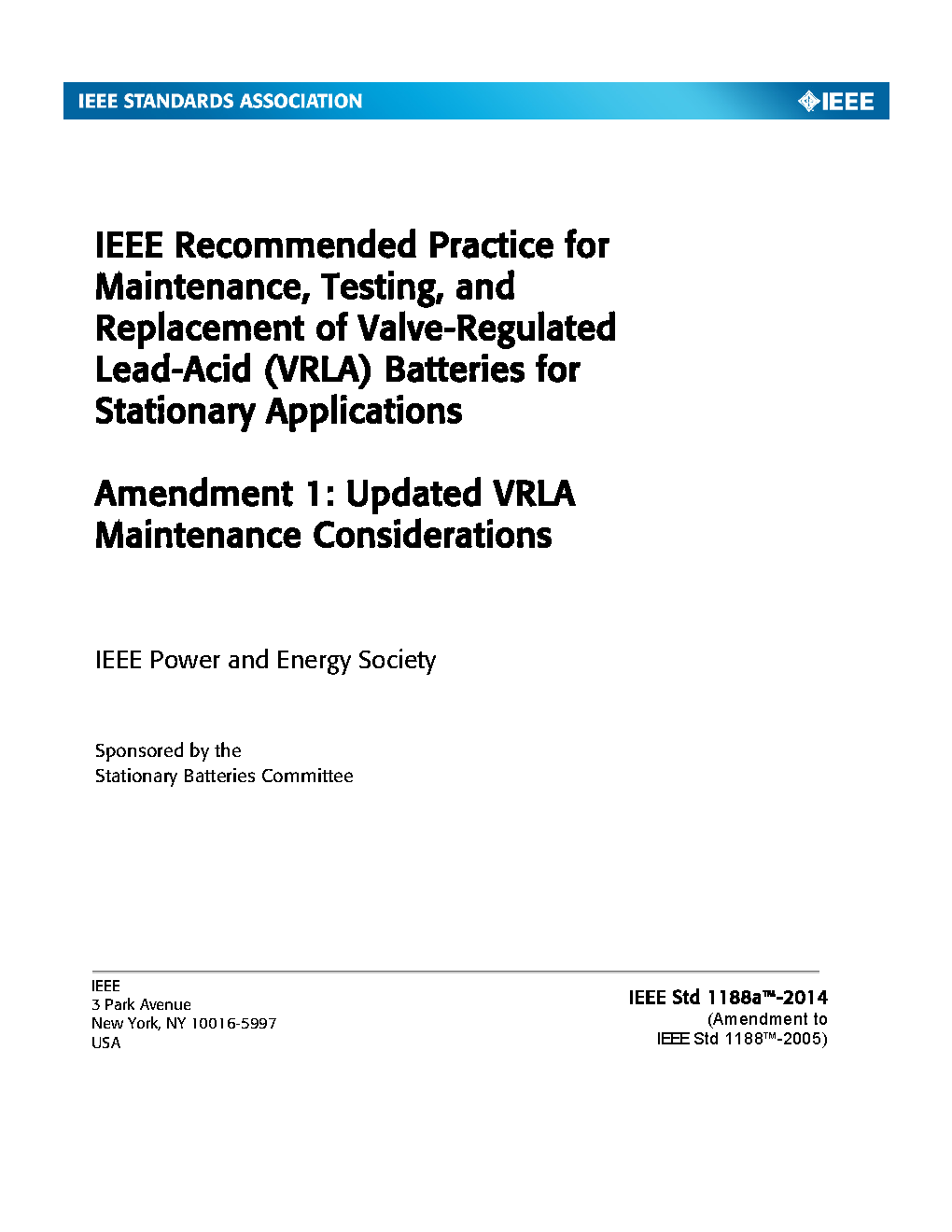 IEEE Recommended Practice for Maintenance, Testing, and Replacement of Valve-Regulated Lead-Acid (VRLA) Batteries for Stationary Applications