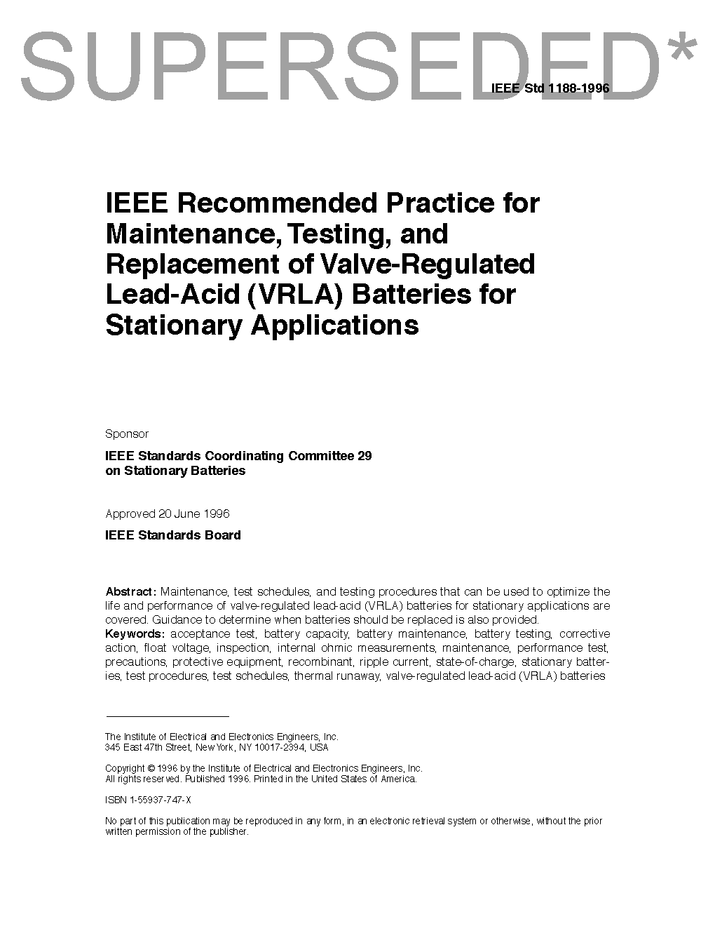 This recommended practice is limited to maintenance, test schedules, and testing procedures that can be used to optimize the life and performance of valve-regulated lead-acid (VRLA) batteries for stationary applications. It also provides guidance to determine when batteries should be replaced.