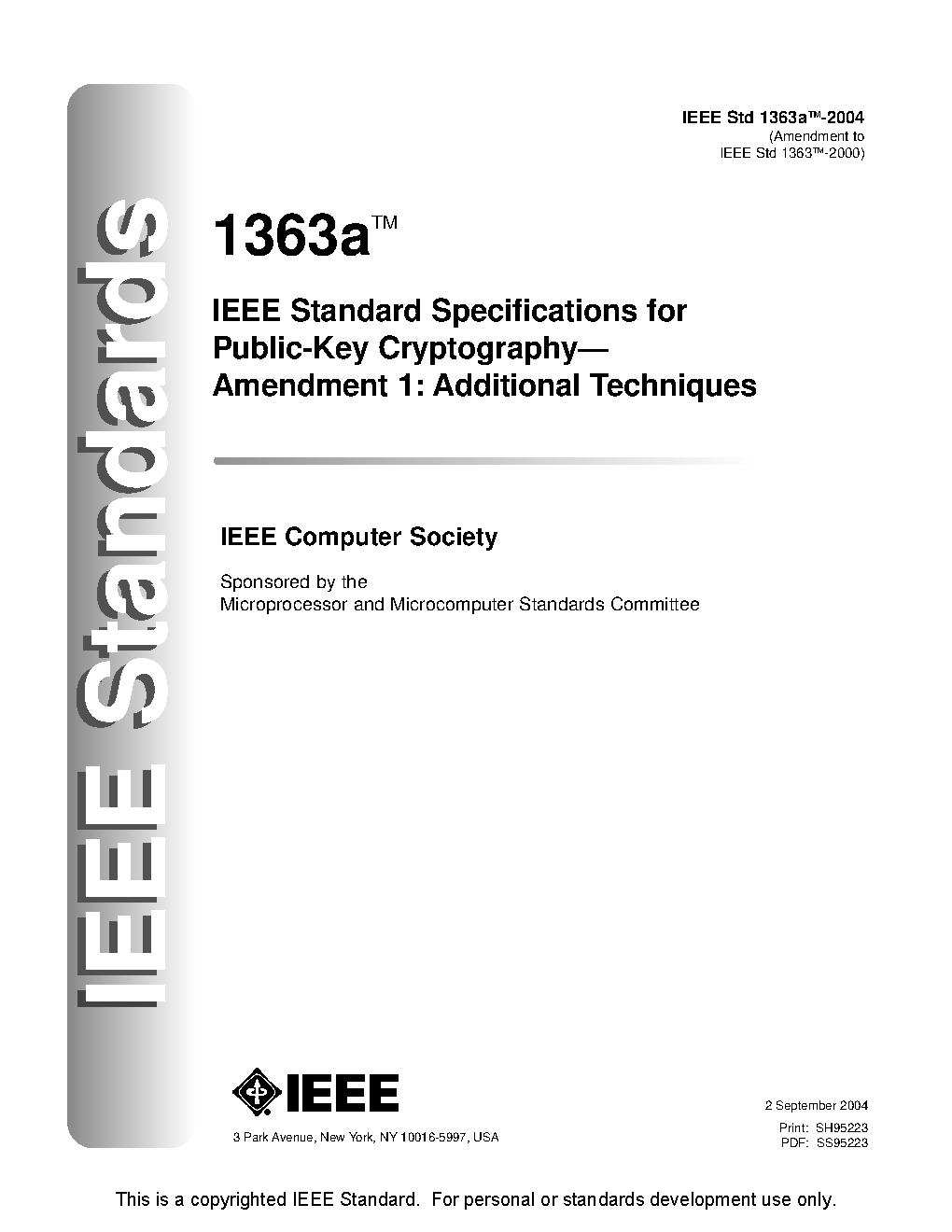 Amendment to IEEE Std 1363-2000, this standard specifies additional public-key cryptographic techniques beyond those in IEEE Std 1363-2000. It is intended to be merged with IEEE Std 1363-2000 during future revisions.