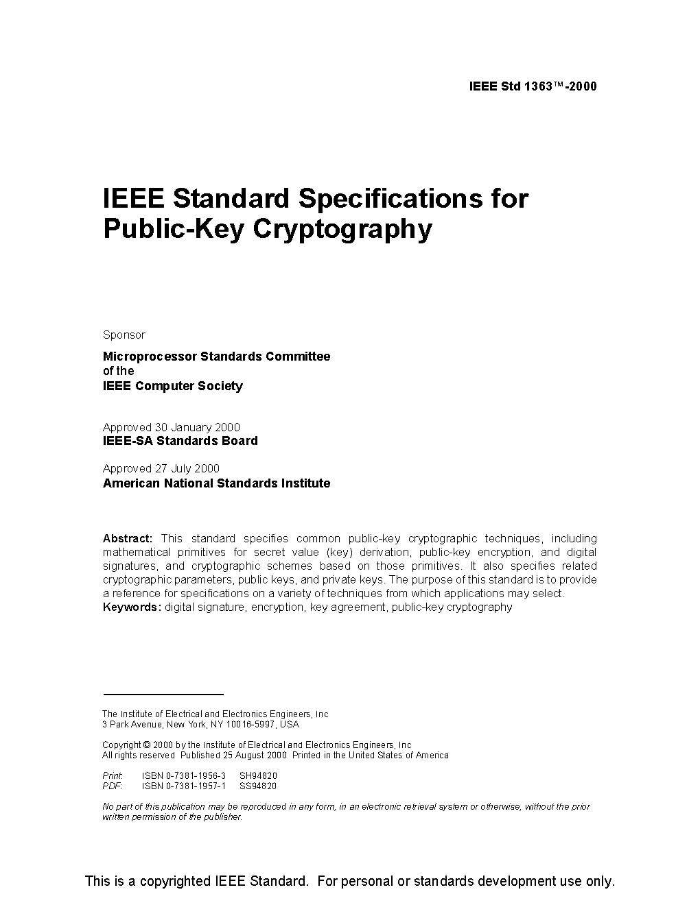 Specifications of common public-key cryptographic techniques supplemental to those considered in IEEE Std 1363-2000, including mathematical primitives for secret value (key) derivation, public-key encryption, digital signatures, and identification, and cryptographic schemes based on those primitives. Specifications of related cryptographic parameters, public keys and private keys. Class of computer and communications systems is not restricted.