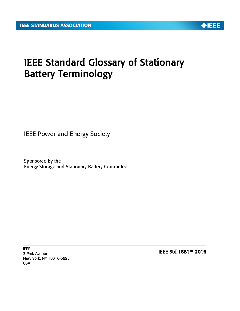 This standard defines terms currently in use in the field of stationary batteries. This standard does not include terms specific to battery manufacturing activities or to non-stationary battery applications such as motive, portable, marine, or other such applications.