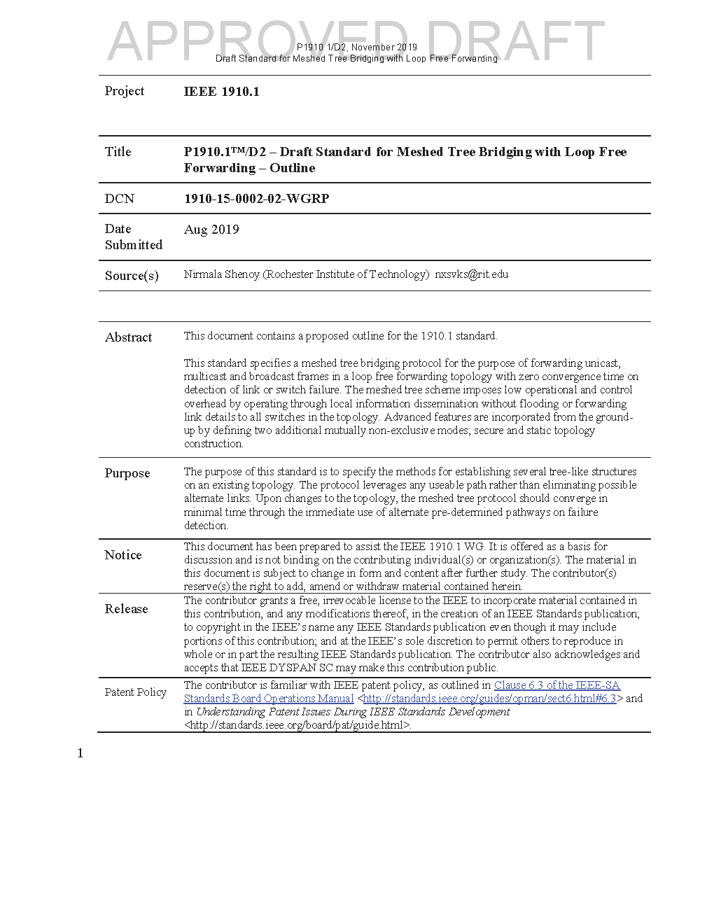 The purpose of this standard is to specify the methods for establishing several tree-like structures on an existing topology. The protocol leverages any useable path rather than eliminating possible alternate links. Upon changes to the topology, the meshed tree protocol will converge in zero time through the immediate use of alternate predetermined viable pathways on failure detection.
