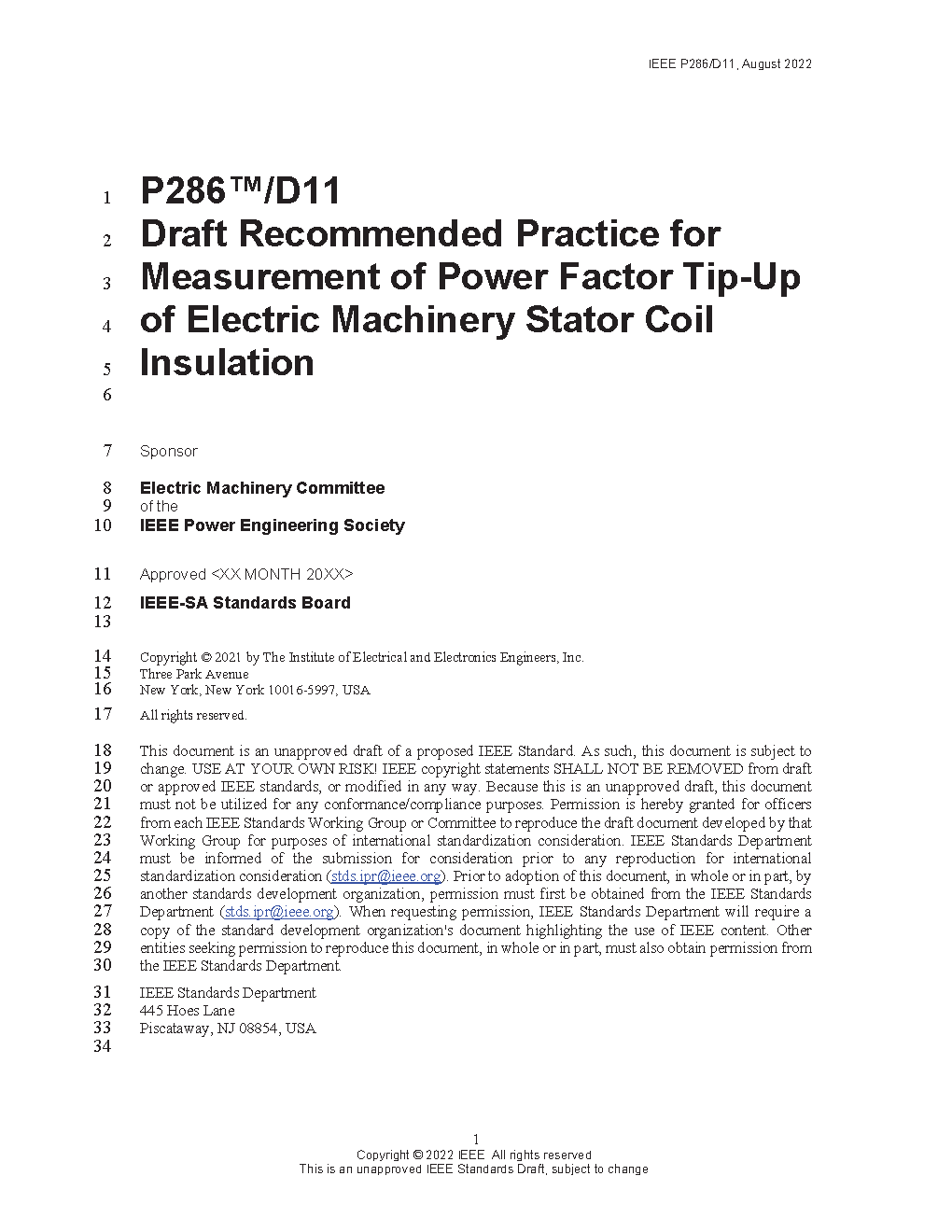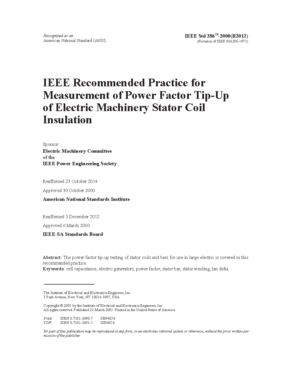 IEEE Recommended Practice for Measurement of Power-Factor Tip-Up of Rotating Machinery Stator Coil Insulation