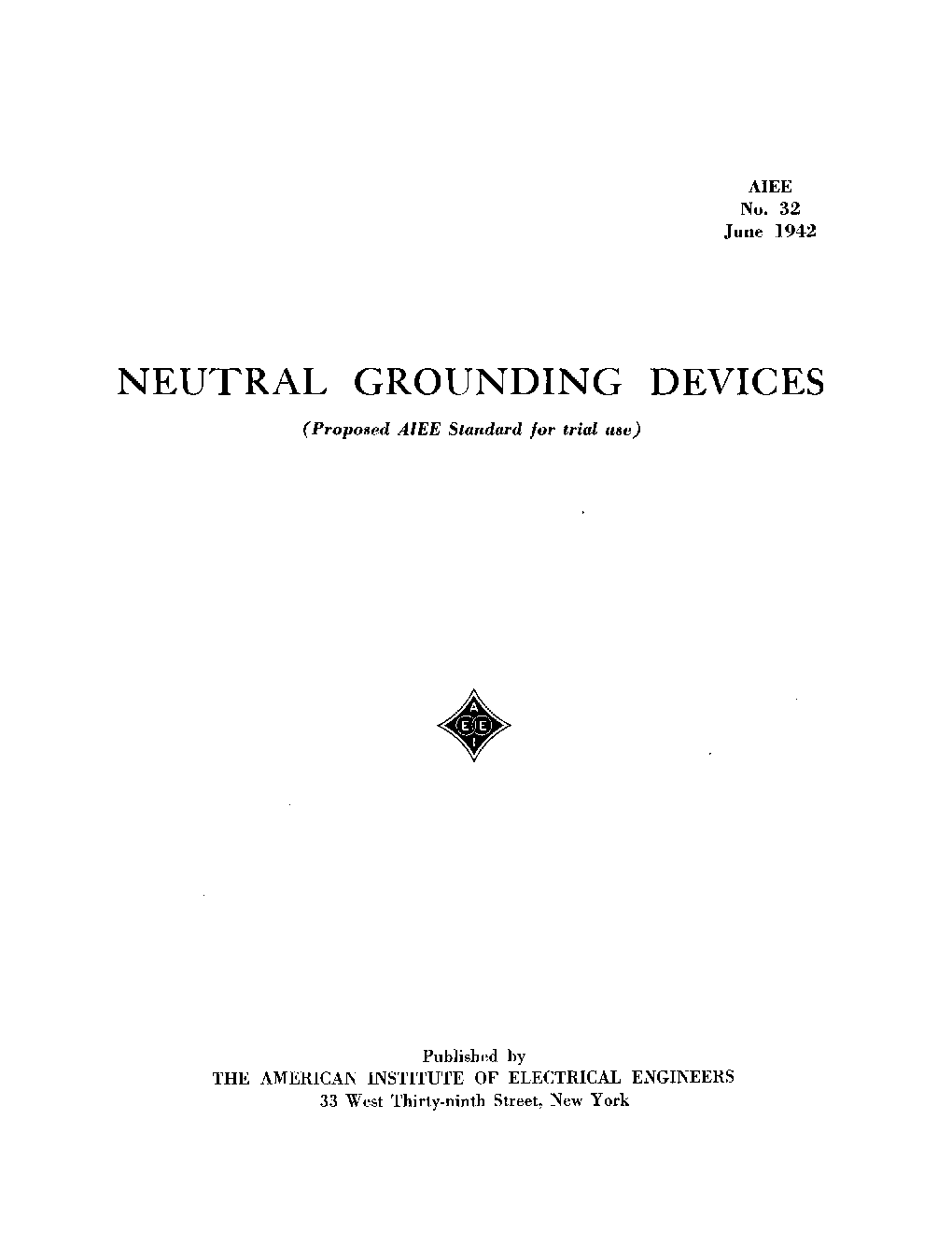IEEE Std 32-1972 (Reaff 1990); IEEE Standard Requirements, Terminology, and Test Procedures for Neutral Grounding Devices. This standard applies to devices (other than surge arresters) used for the purpose of controlling the ground current or the potentials to ground of alternating current systems. It defines usual and unusual service conditions, and gives bases for rating such devices. Specifications are given for temperature limitations, dielectric tests, routine tests, losses and impedance measurements, and construction items.