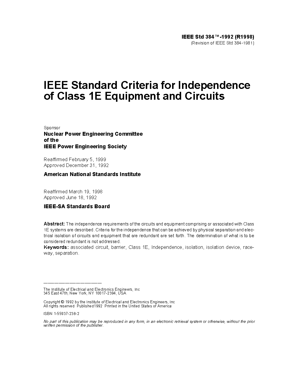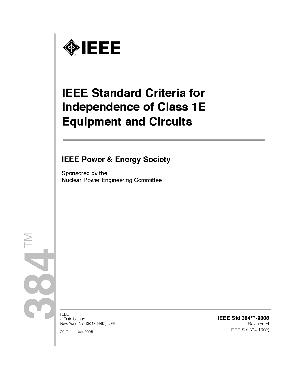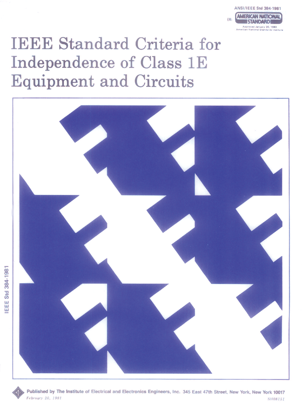 This standard established the criteria for implementation of the independence requirements of IEEE Std 603-1980,[12]; ANSI/IEEE Std 279-1971[3]; IEEE Std 308-1980[9]. In addition, this standard provides interim criteria for implementation of independence requirements for safe shutdown systems.