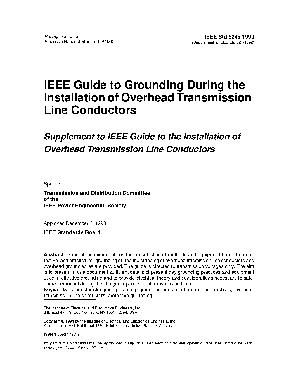 effective and practical for grounding during the installation of overhead transmission line conductors and overhead ground wires. This guide is directed at transmission voltages only. Installation of overhead conductors for distribution circuits generally involves similar conditions; however, the specific recommendations of this guide have not been developed to include all situations encountered at distribution voltages. The guide also includes a comprehensive list of definitions for equipment and tools used in effective grounding during the stringing operation.