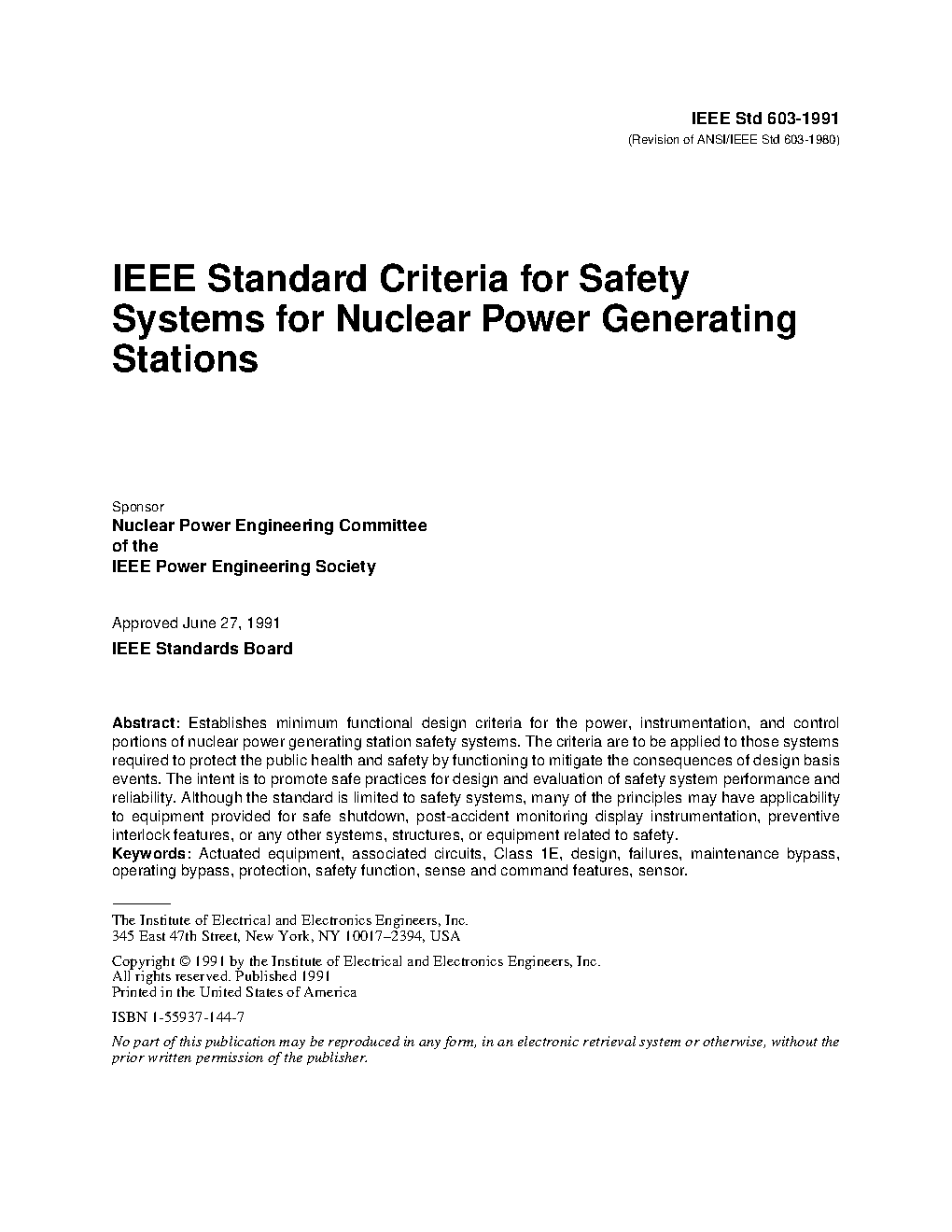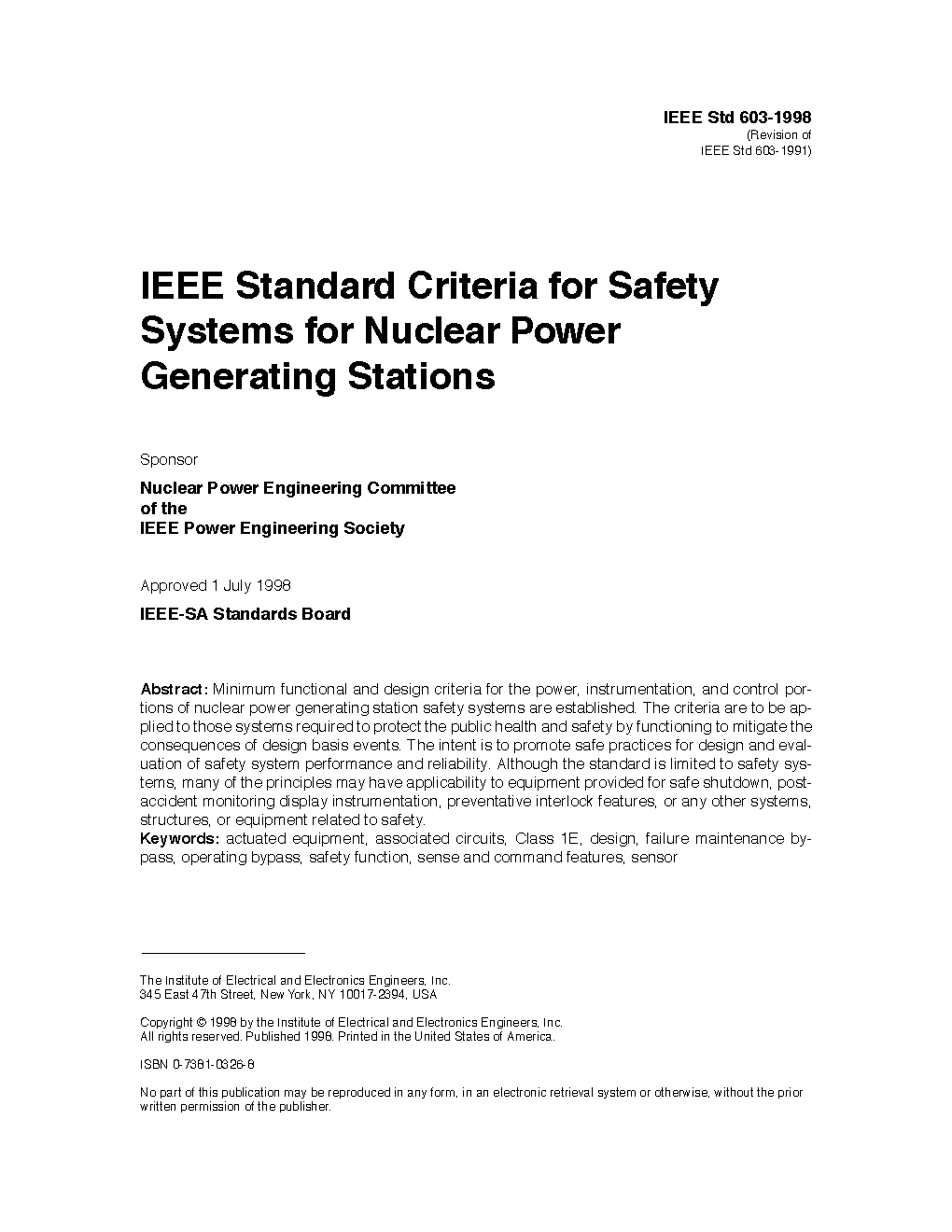 The criteria contained in this standard establish minimum functional and design requirements for the power, instrumentation, and control portions of safety systems for nuclear power generating stations. To satisfy the criteria in this standard, interface requirements may be imposed on the other portions of the
