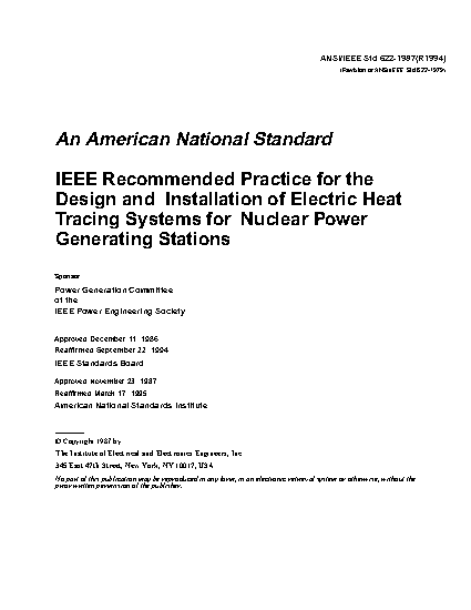 This document provides recommended practices for designing and installing electric heat tracing systems in nuclear power generating stations. These electric heat tracing systems are applied, both for critical process temperature control and for process temperature control, on mechanical piping systems that carry borated water, caustic soda, and other solutions. Electric heat tracing systems are also applied on water piping systems to prevent them from freezing in cold weather. The recommendations include identification of requirements, heater design considerations, power systems design considerations, temperature control considerations, alarm considerations, finished drawings and documents, installation of materials, startup testing, temperature tests, and maintenance of electric pipe heating systems.