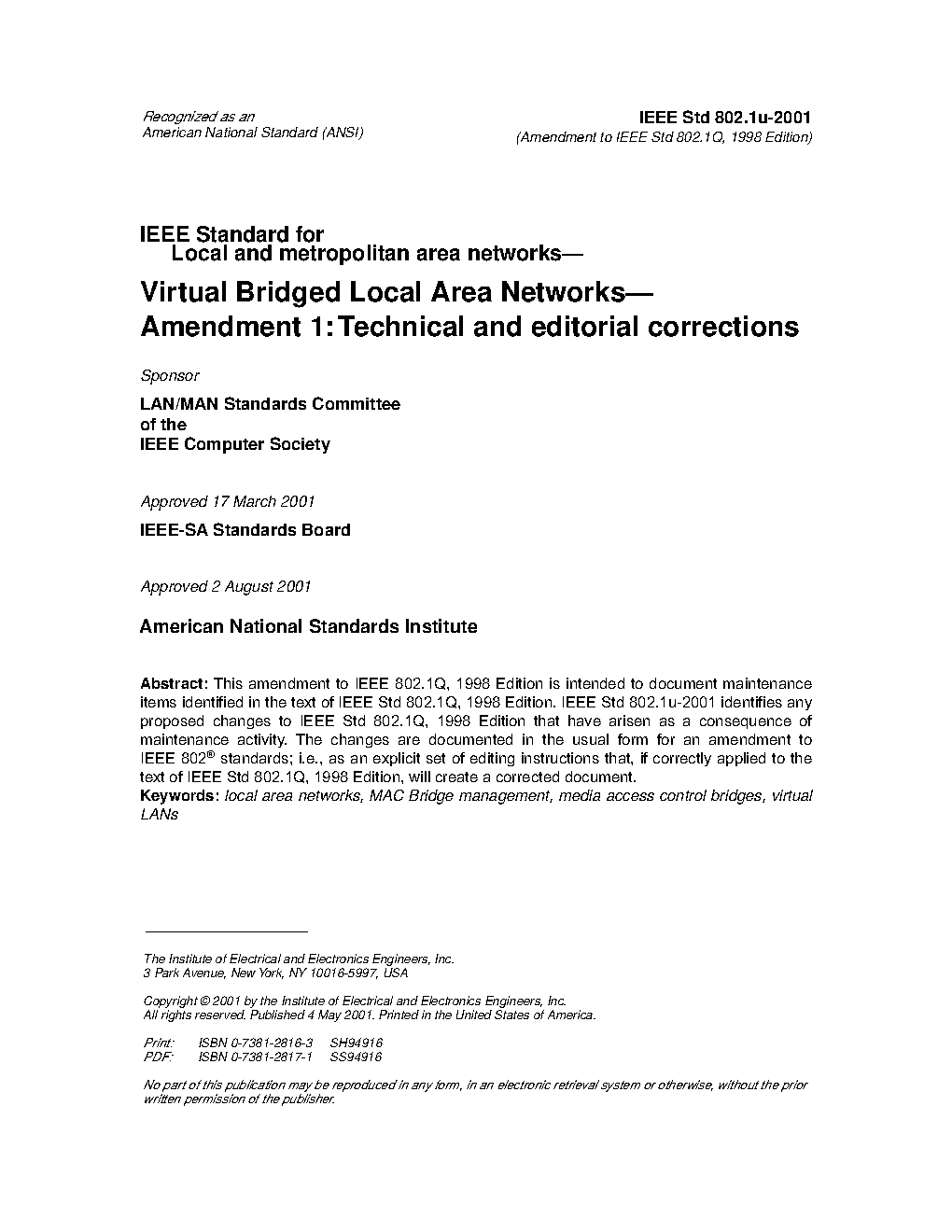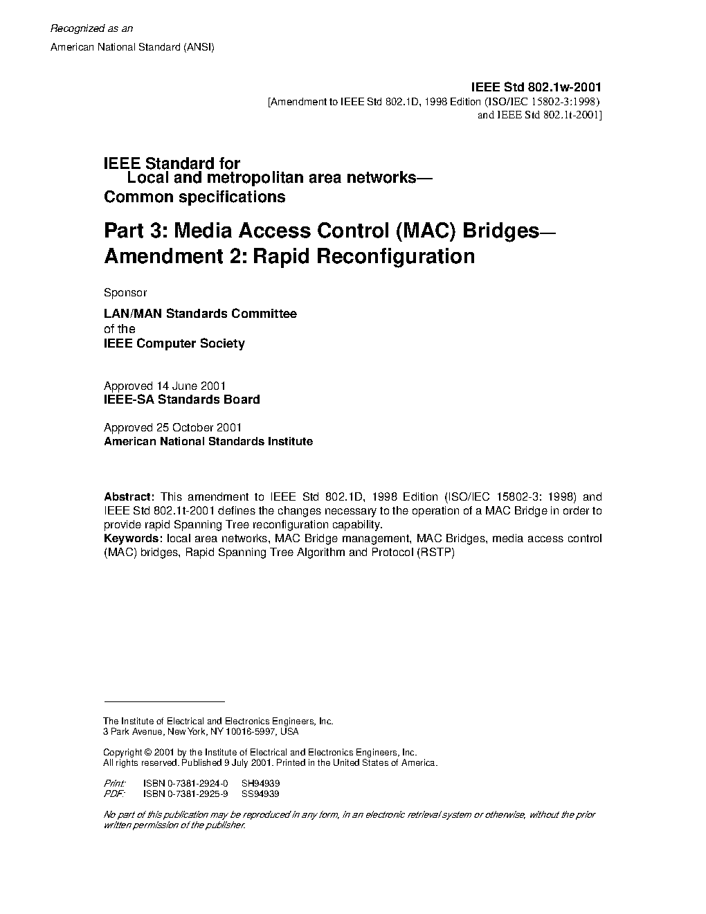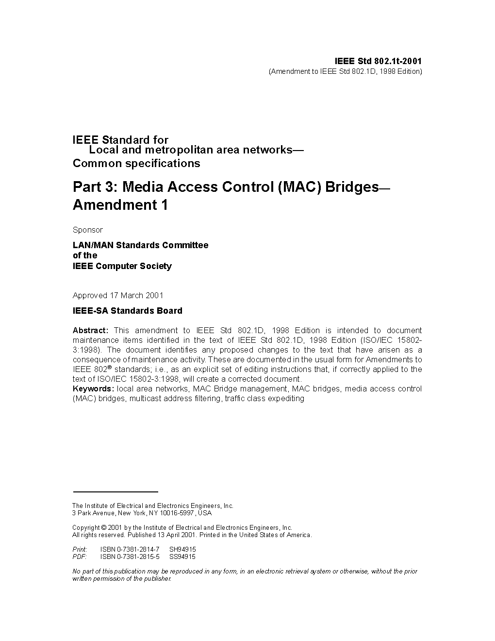 This amendment to IEEE Std 802.1Q specifies the function of a MAC Relay with two MACs, and the protocols and procedures to support its operation. A MAC Relay is transparent to all frame-based media independent protocols except those explicitly addressed to this device. It is remotely manageable through at least one of its external MACs, and signals a failure of either MAC's LAN through the other MAC.