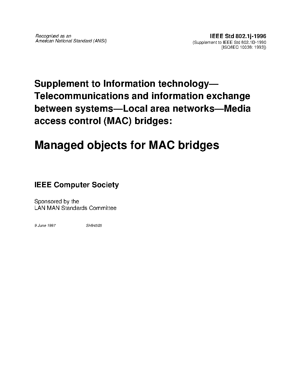 This standard specifies the function of a MAC Relay with two MACs, and the protocols and procedures to support its operation. A MAC Relay is transparent to all frame-based media independent protocols except those explicitly addressed to this device. It is remotely manageable through at least one of its external MACs, and signals a failure of either MAC's LAN through the other MAC.