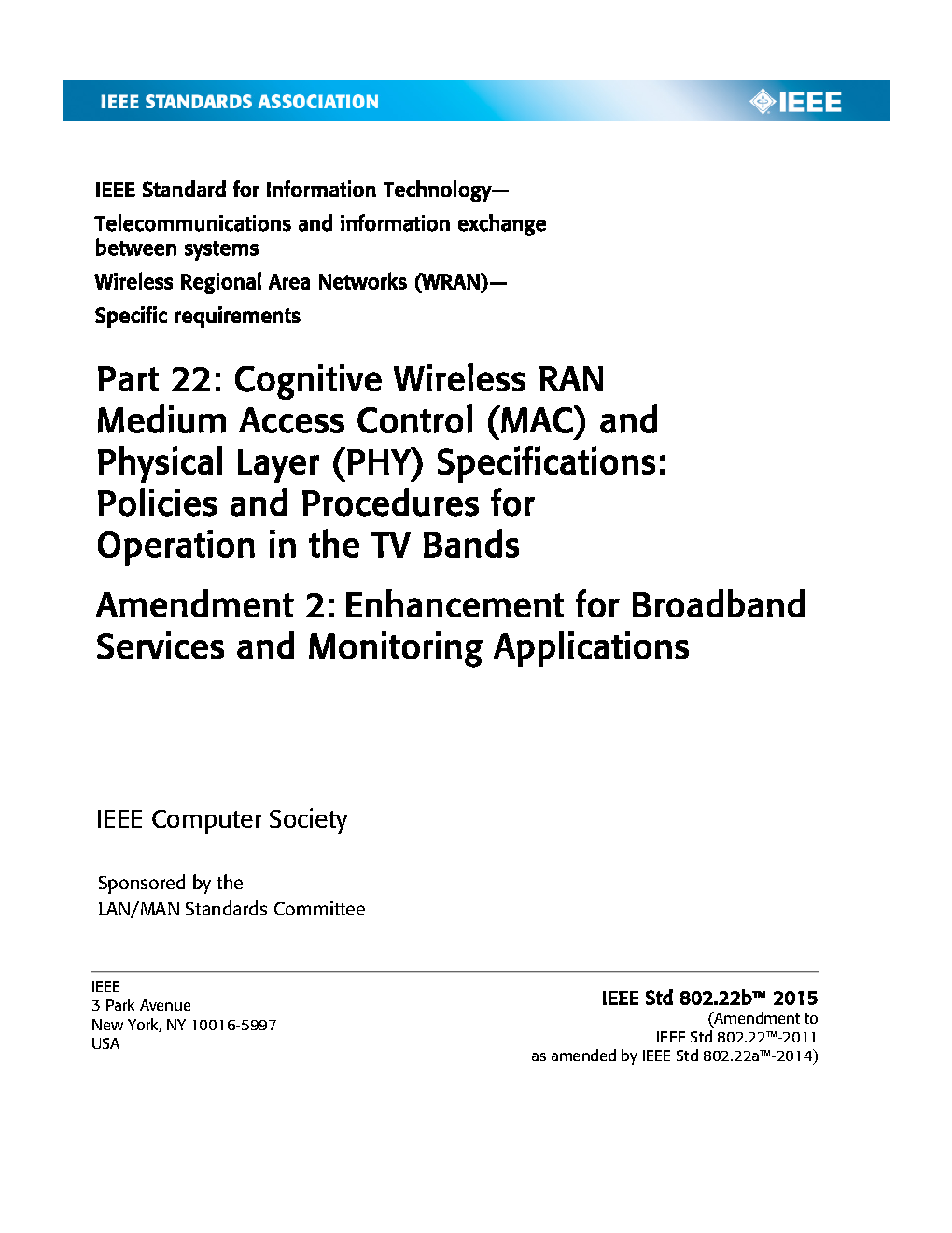 This air interface, including the medium access control layer (MAC) and physical layer (PHY), of the fixed and portable point-to-multipoint wireless regional area networks (WRANs) operating in spectrum allocated to the Television Broadcasting Service in the frequency range of 54 MHz to 862 MHz is described in this amendment.