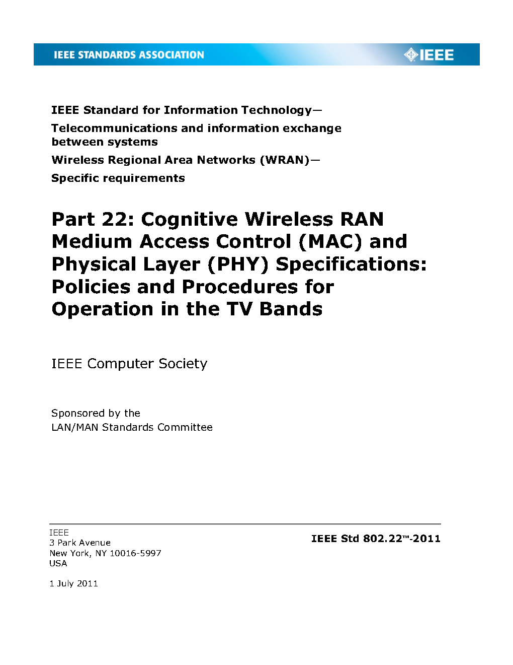 IEEE Standard for Information Technology--Telecommunications and information exchange between systems Wireless Regional Area Networks (WRAN)--Specific requirements - Part 22: Cognitive Wireless RAN Medium Access Control (MAC) and Physical Layer (PHY) Specifications: Policies and Procedures for