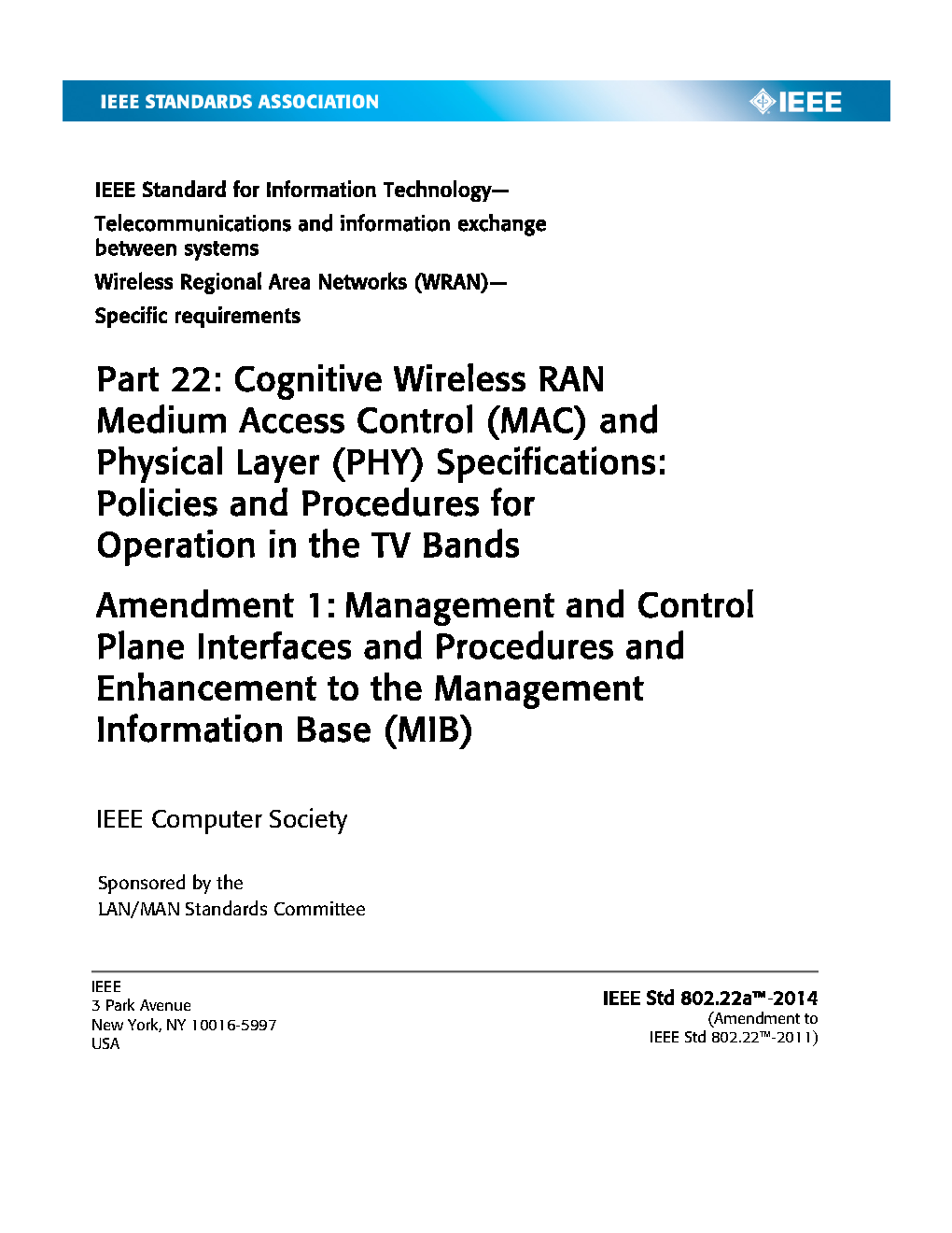 This amendment defines a new clause for Management and Control Plane Interfaces and Procedures to the existing IEEE Std 802.22-2011 for operation in VHF/UHF TV broadcast bands between 54 MHz and 862 MHz. The Management Information Base (MIB) structure enhancements include changes to comply with the ASN.1 format and support for the new clause. Modifications to the existing clause on Primitives for Cognitive Radio Capabilities to align it with the content in the MIB clause and the new clause are also defined.