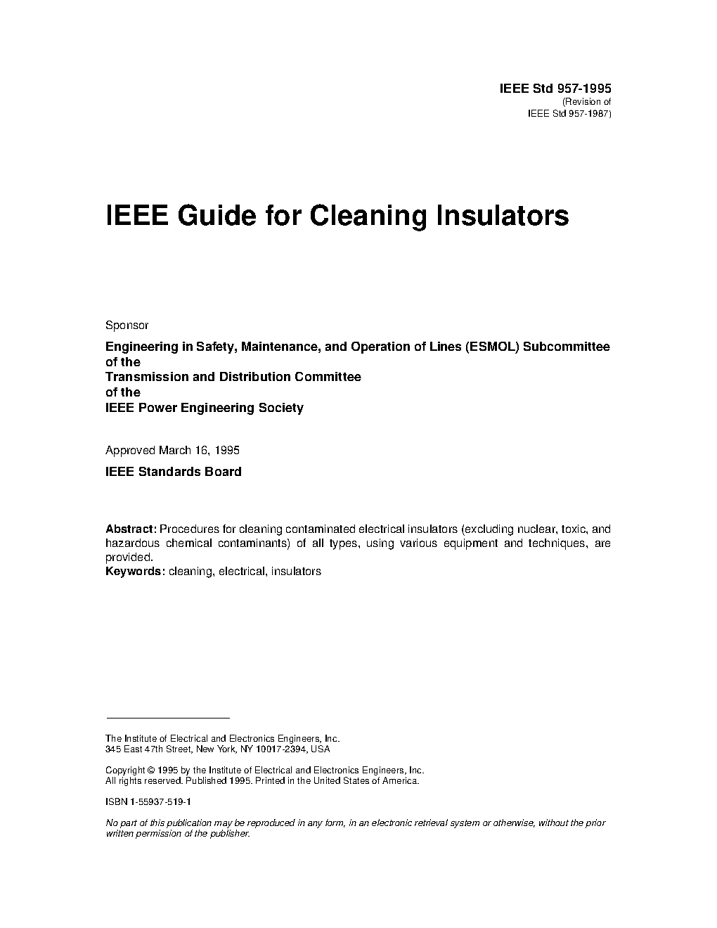 The methods or equipment, or both, presented in this guide are not intended to prescribe specific procedures, but to present the successful experience of many individuals who have safely cleaned contaminated insulators. The guide is intended to serve as a reference source for a company, or persons, seeking information on insulator cleaning procedures so that they may consider the experience of others in modifying or formulating insulator cleaning programs and practices.
