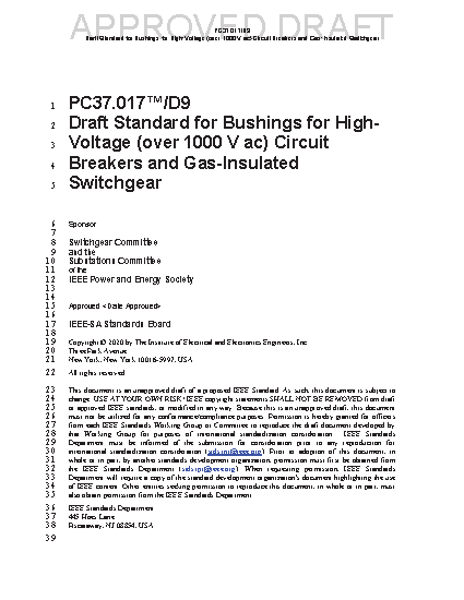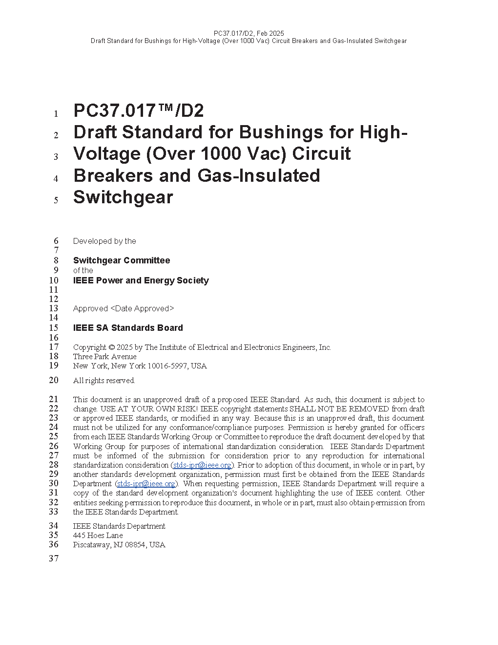 This standard is applicable to bushings intended for use in high-voltage circuit breakers and gas-insulated switchgear. These bushings are intended for indoor and outdoor use, operating on alternating current with a rated voltage greater than 1000 V and a frequency of 50 Hz or 60 Hz. These bushings are usually a part of an apparatus and tested according to the apparatus of which they form part. Insulators or bushings used as an element of metal-enclosed switchgear assemblies, or in reclosers, sectionalizers, or similar equipment,