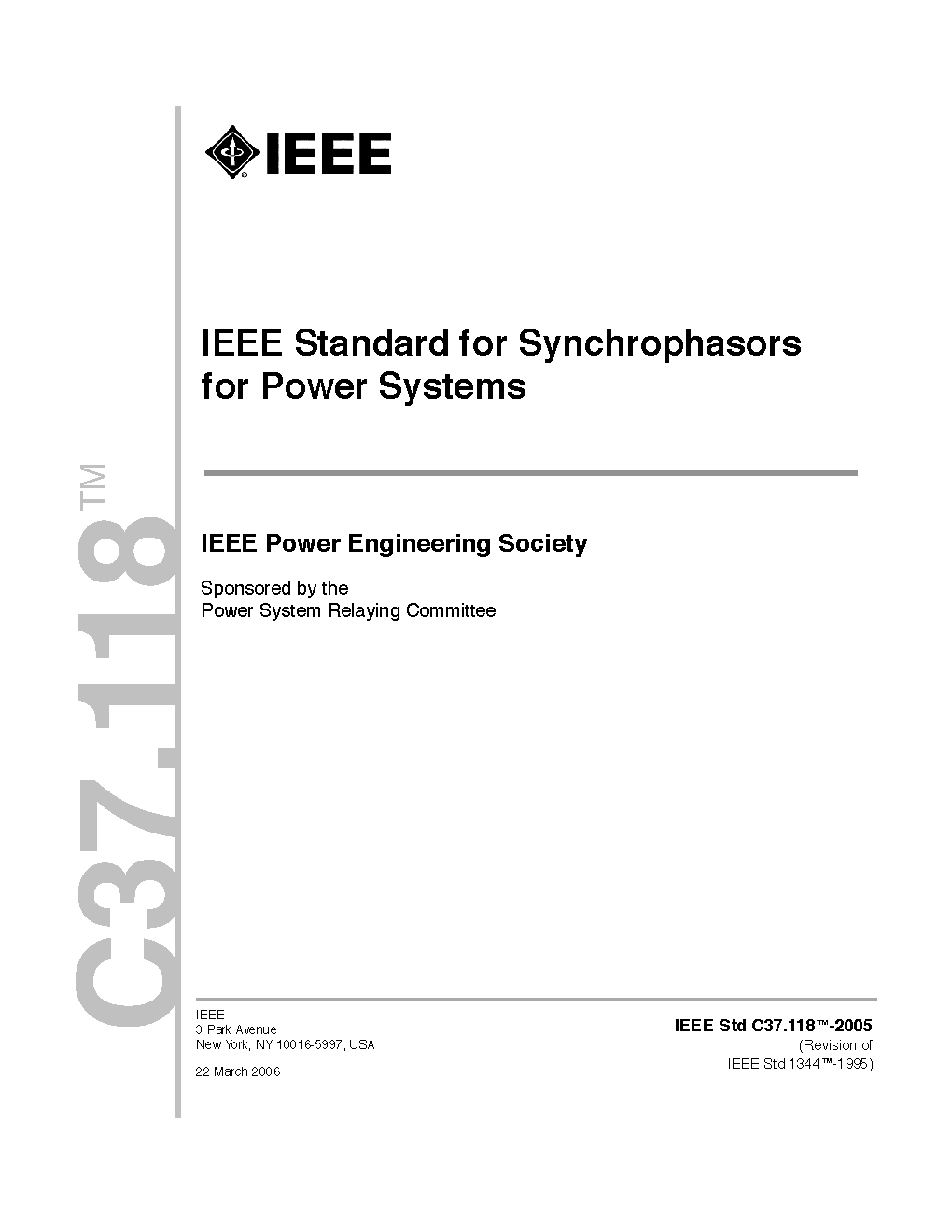 This standard defines synchronized phasor and frequency measurements in substations along with methods and requirements for measurement verification. Measurements compliant with the standard and taken at various locations in the power system can be readily and accurately combined for power system analysis and operations. Time tag and other essential associations are also described to facilitate communication and reliable data application. Communication and recording of phasor measurements are covered in other standards, such as the companion standard IEEE Std C37.118.2-2011.