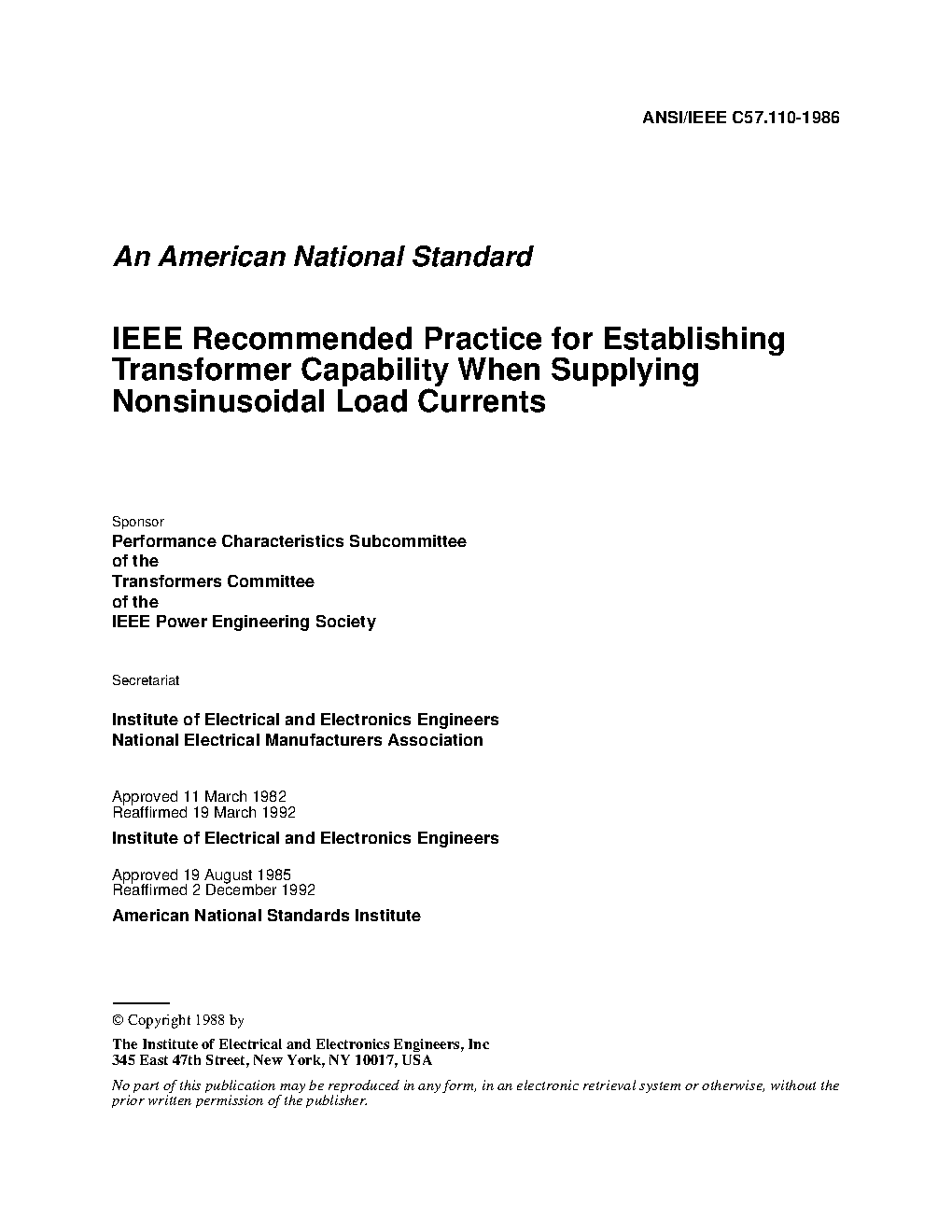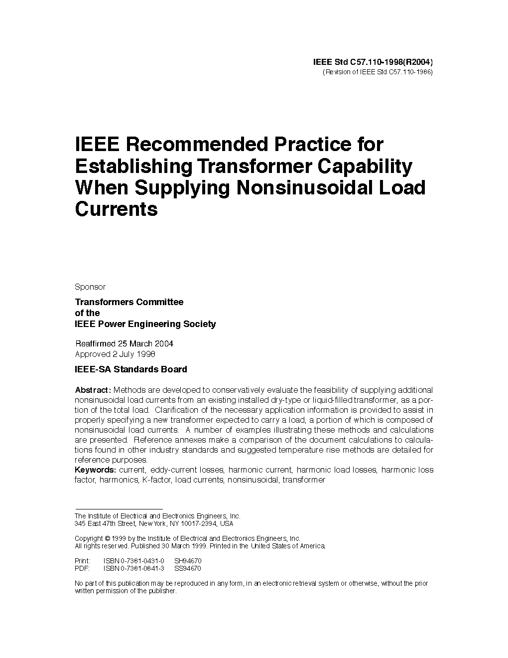 Provided in this recommended practice are calculation methods for conservatively evaluating the feasibility for an existing installed dry-type or liquid immersed transformer, to supply nonsinusoidal load currents as a portion of the total load. Also provided is necessary application information to assist in properly specifying a new transformer expected to carry a load, a portion of which is composed of nonsinusoidal load currents. A number of examples illustrating these methods and calculations are presented. Reference annexes provide a comparison of the document calculations to calculations found in other industry standards. Suggested temperature rise calculation methods are detailed for reference purposes.