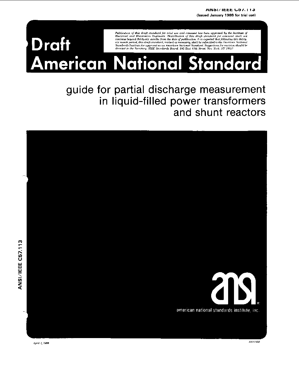 This recommended practice describes the test procedure for the detection and measurement by the wideband apparent charge method of partial discharges (PDs) occurring in liquid-filled power transformers and shunt reactors during dielectric tests, where applicable.