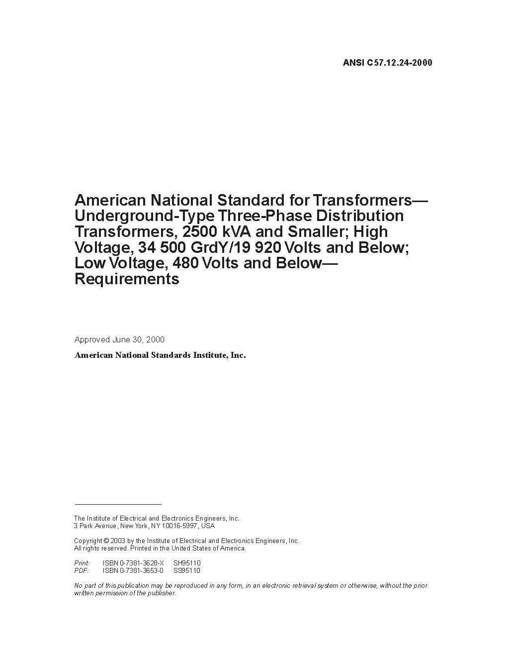 IEEE Standard for Submersible, Three-Phase Transformers, 3750 kVA and Smaller: High Voltage, 34 500 GrdY/19 920 Volts and Below; Low Voltage, 600 Volts and Below