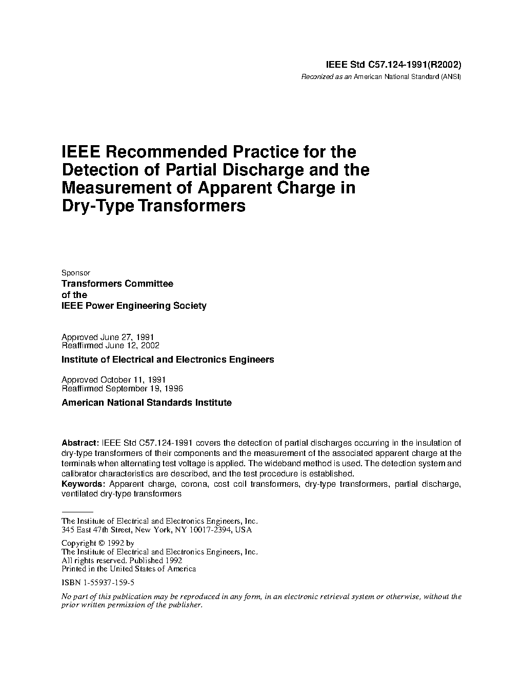 This recommended practice applies to the detection of partial discharges occurring in the insulation of dry-type transformers or their components, and to the measurement of the associated apparent charge at the terminals when an alternating test voltage is applied.