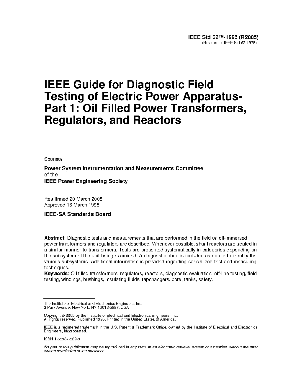 This guide describes diagnostic field tests and measurements that are performed on fluid-filled power transformers and regulators. Whenever possible, shunt reactors are treated in a similar manner to transformers. The tests are presented systematically in categories depending on the subsystem of the unit being examined. A diagnostic chart is included as an aid to identifying the various subsystems. Additional information is provided regarding specialized test and measuring techniques. Interpretive discussions are also included in several areas to provide additional insight on the particular test or to provide guidance on acceptance criteria. These discussions are based on the authors’ judgment of accepted practice. It should be noted that the results of several types of tests should be interpreted together to diagnose a problem. Manufacturers’ acceptance criteria and other standards in the IEEE C57™ series take precedence over the content of this guide.