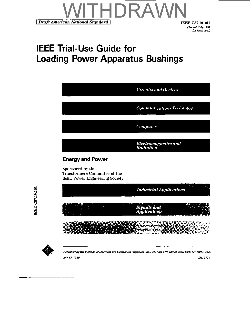 Electrical, dimensional, and related requirements for outdoor power- class apparatus bushings that have basic impulse insulation levels of 110 kV and higher are covered. Specific values for dimensional and related requirements that are to be interpreted, measured, or tested in accordance with IEEE C57.19.00-1991 are provided. Bushings covered by this standard are intended for use as components of oil-filled transformers, oil-filled reactors, and oil circuit breakers