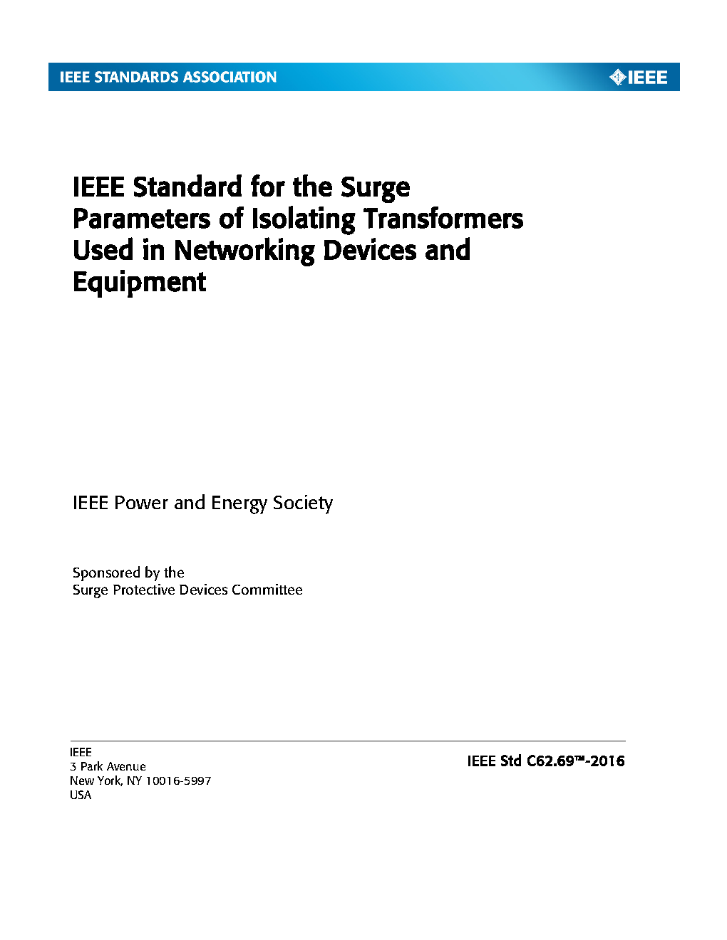 Terms, test methods, test circuits, measurement procedures, and preferred result values for the surge mitigation parameters of isolating transformers used in networking devices and equipment are set in this standard. Three types of isolating transformer are considered: mains low frequency power, high frequency power (switching mode power supplies) and signal (e.g., Ethernet data).