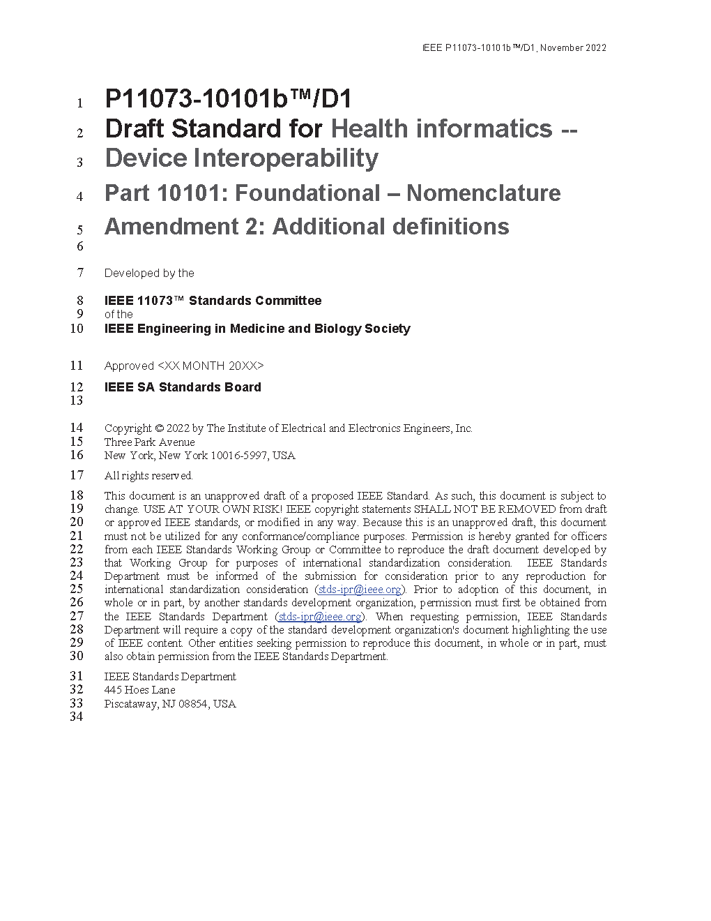 The purpose of this standard is to define the unique terms and concepts required for point-of-care medical device data communication. This document will serve as the data dictionary for present and future medical device data communication applications.