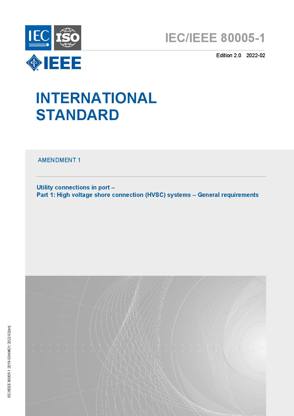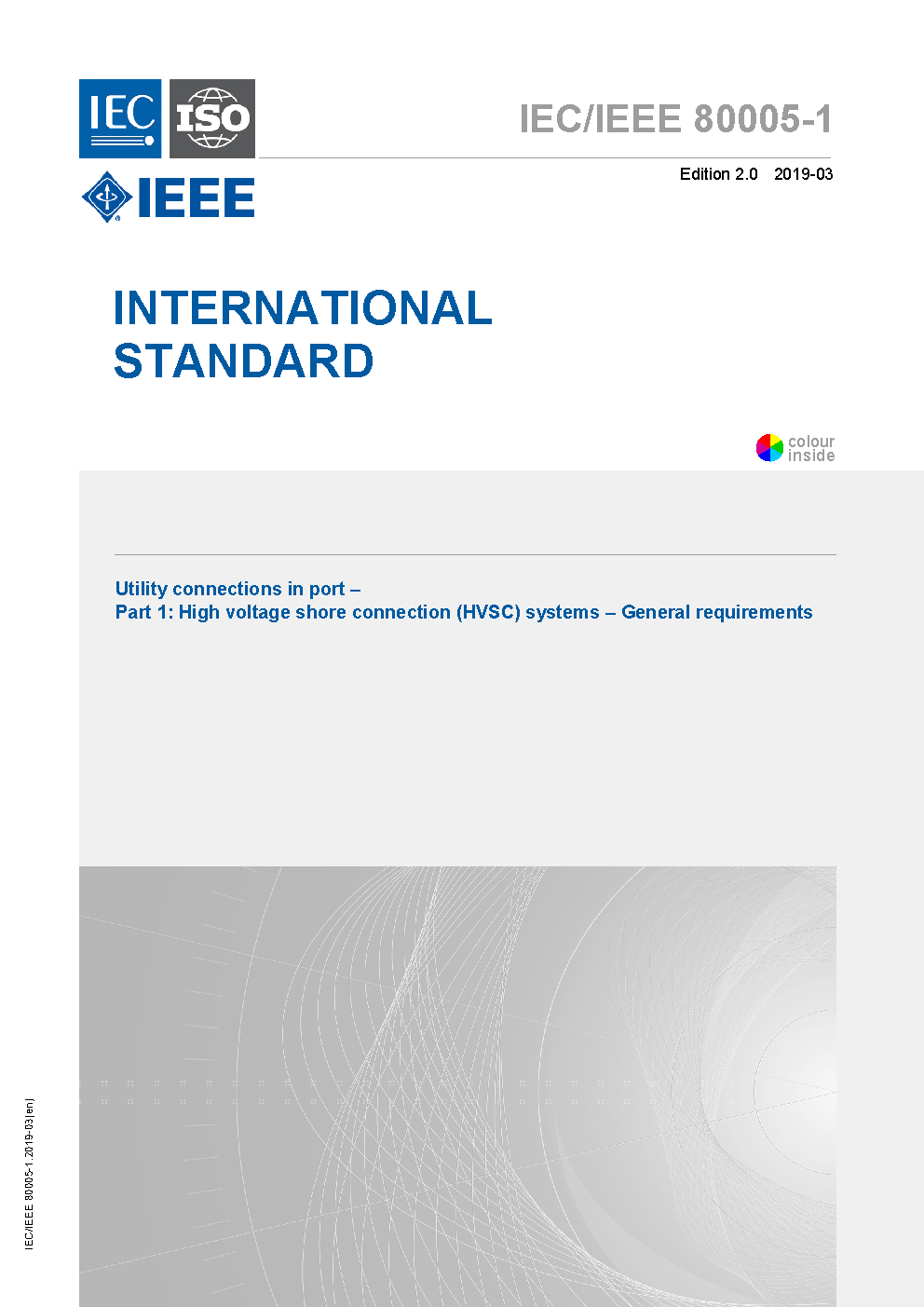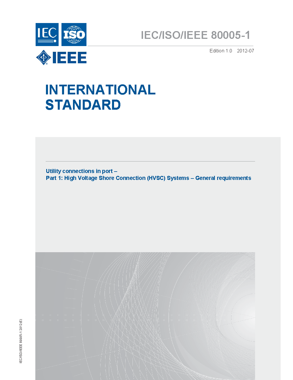 IEC/ISO/IEEE 80005-1-2012 describes high voltage shore connection (HVSC) systems, on board the ship and on shore, to supply the ship with electrical power from shore. This standard is applicable to the design, installation and testing of HVSC systems and addresses: HV shore distribution systems; shore-to-ship connection and interface equipment; transformers/reactors; semiconductor/rotating converters; ship distribution systems; and control, monitoring, interlocking and power management systems. It does not apply to the electrical power supply during docking periods, e.g. dry docking and other out of service maintenance and repair.