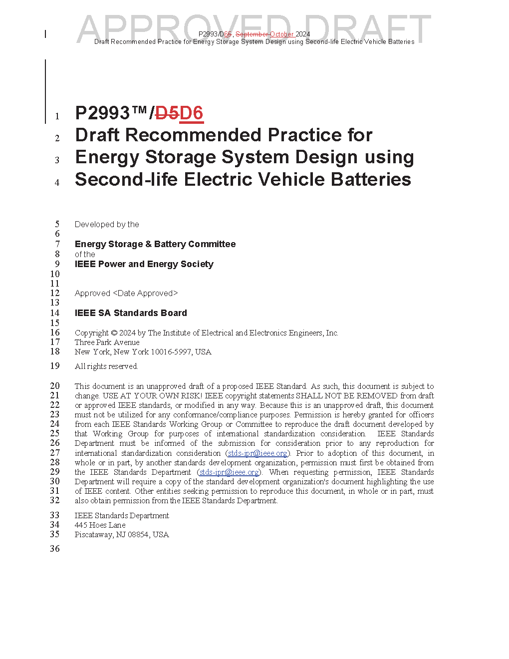 The selection and repurposing (including 1 design, operation and maintenance) of second-life electric vehicle batteries in energy storage systems with voltage levels of 10 kV and below is described in this recommended practice. Various technical indexes of batteries and equipment are assessed in different stages of engineering to evaluate the system's efficiency, safety, and economic aspects.