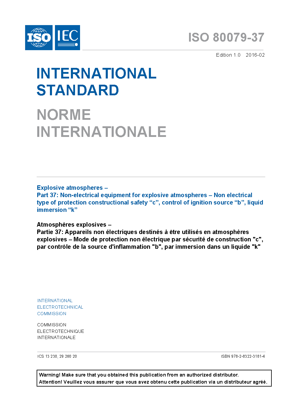 ISO 80079-37:2016 Explosive atmospheres - Part 37: Non-electrical equipment for explosive atmospheres - Non electrical type of protection constructional safety "c", control of ignition source "b", liquid immersion "k"