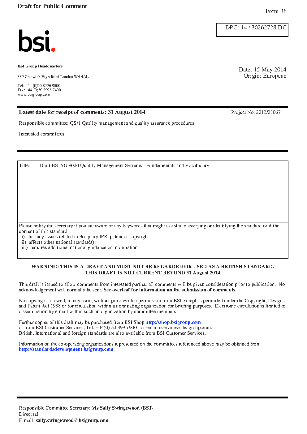 BS EN ISO 9000. Quality Management Systems. Fundamentals and Vocabulary