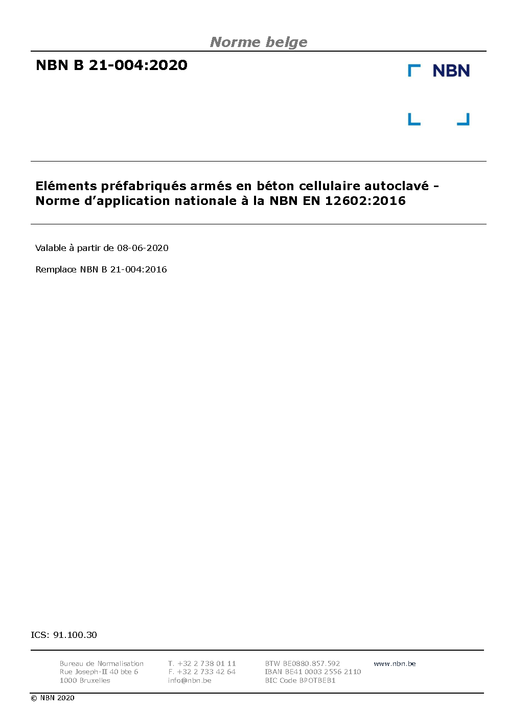 La présente norme qui constitue l’Annexe Nationale à la NBN EN 12602 a été établie par la Commission de normalisation belge E177 qui agît comme commission-miroir nationale du Comité Technique européen CEN/TC177, “Eléments préfabriqués armés en béton cellulaire autoclavé ou en béton de granulats légers à structure ouverte”. Cette commission belge est active au sein de PROBETON asbl, association désignée par le NBN en exécution de l'Arrêté Royal du 21 octobre 2004, comme opérateur sectoriel de normalisation pour les travaux de cette commission.