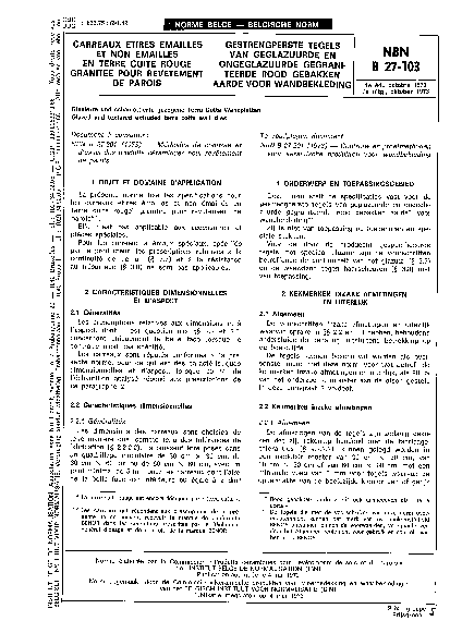 La présente norme fixe les spécifications pour les carreaux étirés émaillés et non émaillés en terre cuite rouge (la terre cuite rouge est encore désignée par "terra cotta") granitée pour revêtement de parois (les carreaux qui répondent aux prescriptions de la présente norme peuvent recevoir la marque de conformité BENOR dans les conditions prescrites par le Règlement général d'usage et de contrôle de la marque BENOR).
