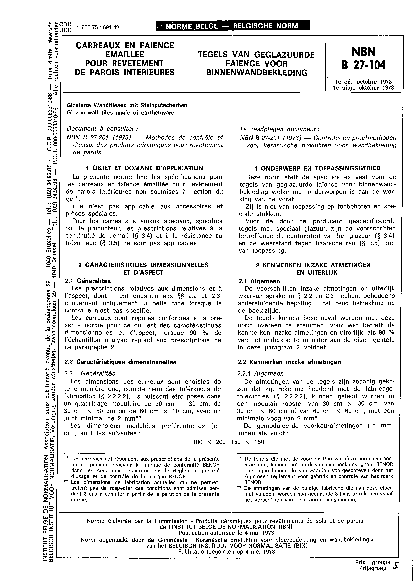 La présente norme fixe les spécifications pour les carreaux en faïence émaillée pour revêtement de parois intérieures non soumises à l'action du gel (les carreaux qui répondent aux prescriptions de la présente norme peuvent recevoir la marque de conformité BENOR dans les conditions prescrites par le Règlement général d'usage et de contrôle de la marque BENOR).