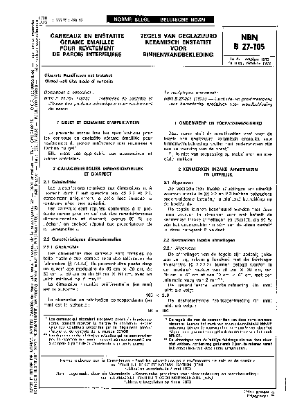 La présente norme fixe les spécifications pour les carreaux en enstatite cérame émaillée pour revêtement de parois intérieures non soumises à l'action du gel (les carreaux qui répondent aux prescriptions de la présente norme peuvent recevoir la marque de conformité BENOR dans les conditions prescrites par le Règlement général d'usage et de contrôle de la marque BENOR).