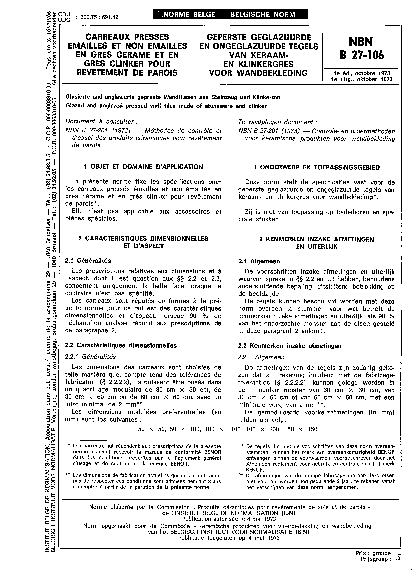 La présente norme fixe les spécifications pour les carreaux pressés émaillés et non émaillés en grès cérame et en grès clinker pour revêtement de parois (les carreaux qui répondent aux prescriptions de la présente norme peuvent recevoir la marque de conformité BENOR dans les conditions prescrites par le Règlement général d'usage et de contrôle de la marque BENOR).