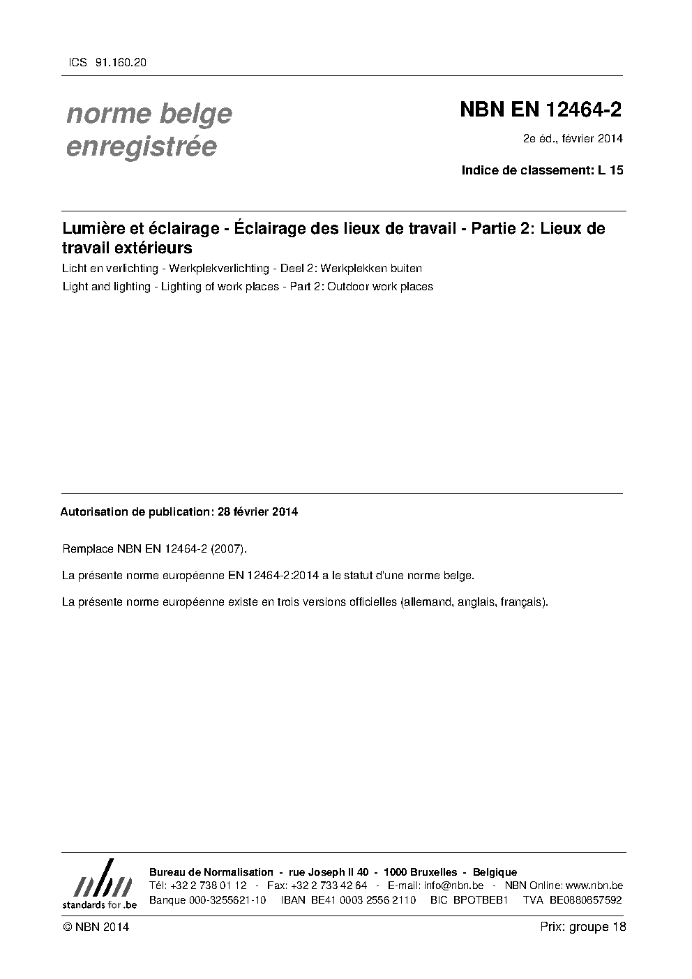 This European standard specifies lighting requirements for outdoor work places, which meet the needs for visual comfort and performance. All usual visual tasks are considered.