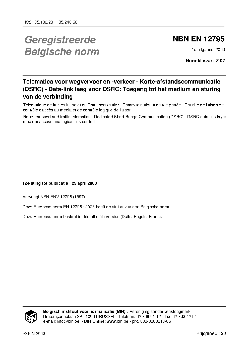 | Publisher | Bureau de Normalisation Belge (NBN) |