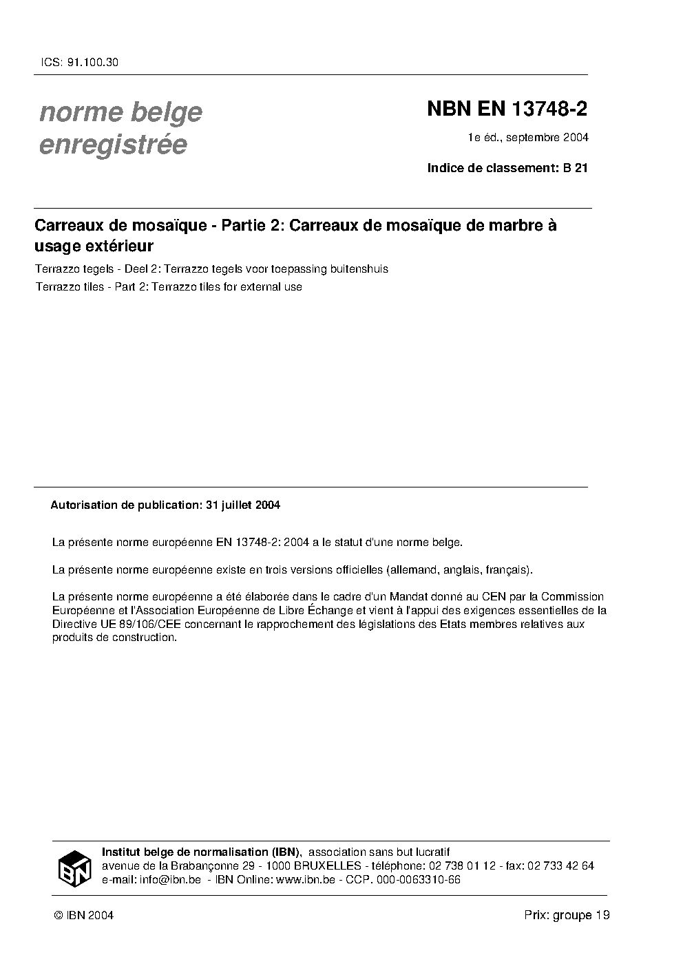 | Publisher | Bureau de Normalisation Belge (NBN) |